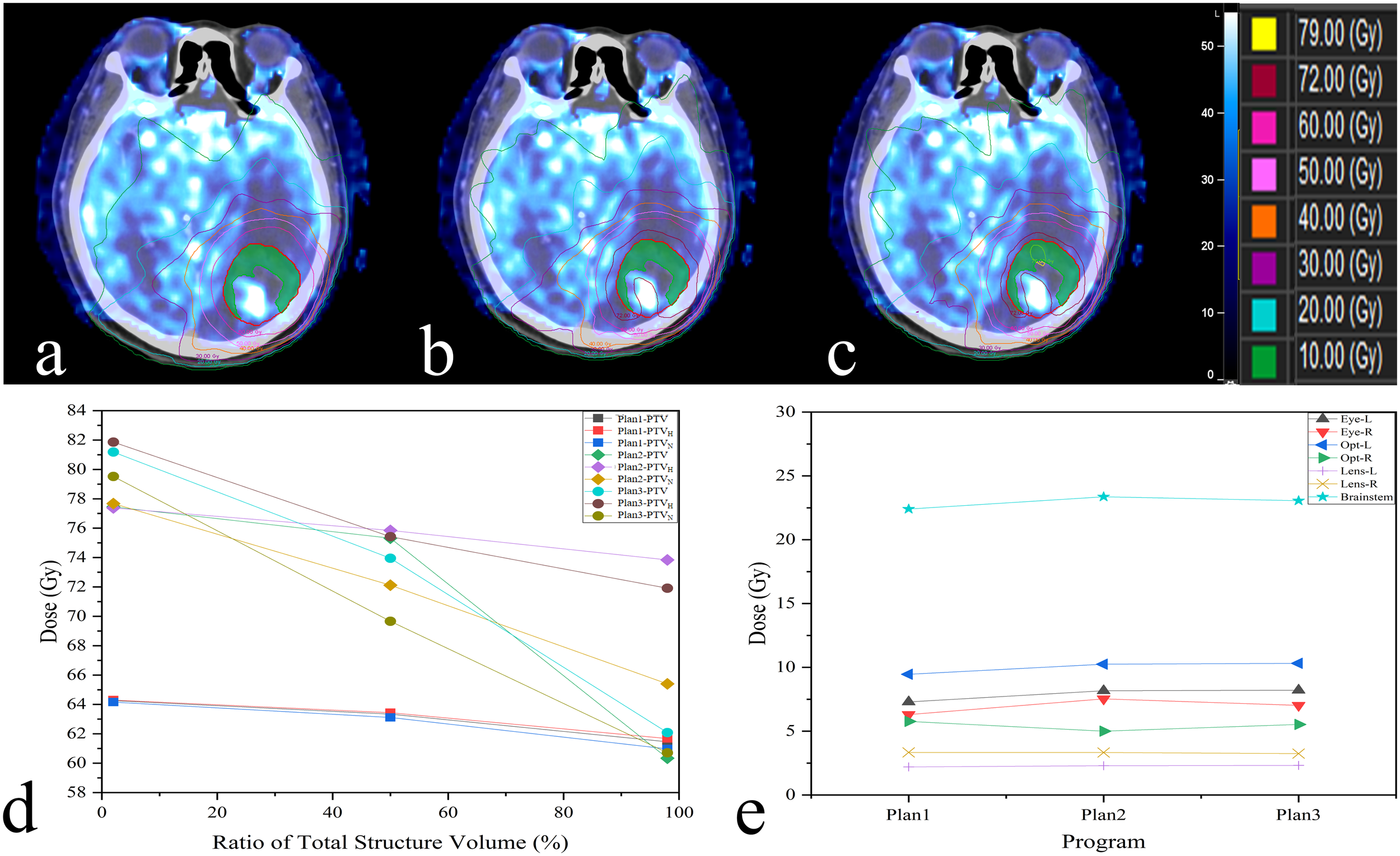The optimized parameters and dose constraints for organs at risk (OARs) among three plans were unified. OARs were restricted to the following doses: Dmax<50 Gy for eye, Dmax<54 Gy for optic nerve, Dmax< 8 Gy for lens, and Dmax<54 Gy for brainstem.