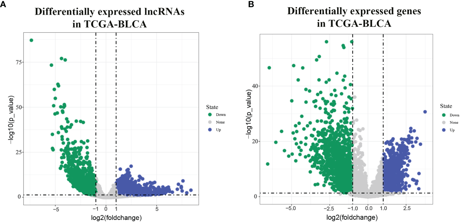 Differentially expressed lncRNAs and mRNAs in TCGA-BLCA. [(A) volcano diagram showing BLCA differentially expressed lncRNA in TCGA; (B) volcano diagram showing BLCA differentially expressed mRNA in TCGA].
