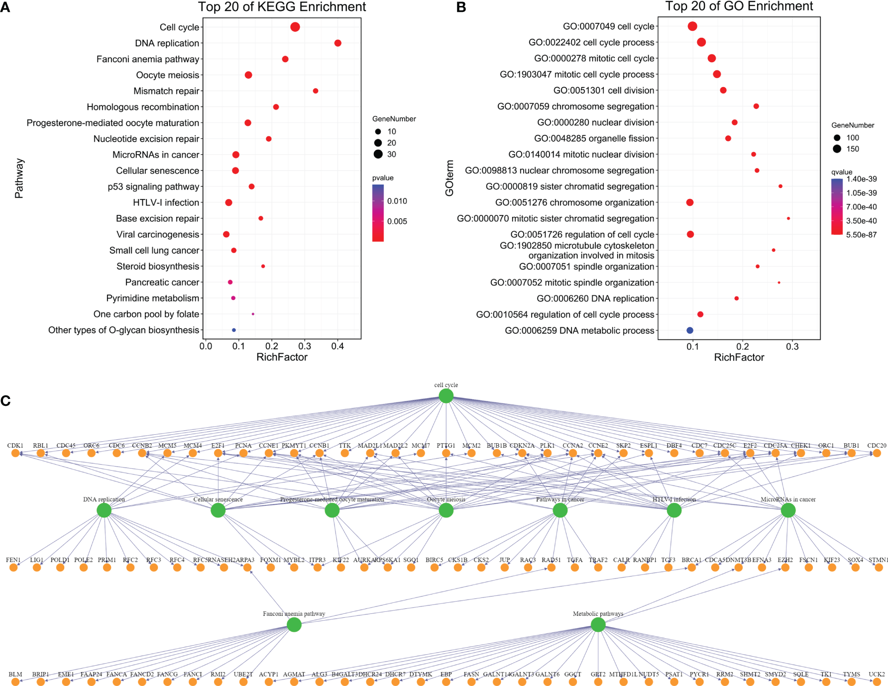 In order to know the biological functions related to tumor progression in the blue plate, the co-expressed mRNAs were annotated using KEGG and GO. KEGG analysis showed that the mRNAs associated with tumor progression were significantly enriched in the cell cycle and DNA repair (Figure 3A); GO analysis revealed that the mRNAs associated with tumor progression were significantly enriched in the cell cycle and cell cycle progression (Figure 3B). The cell cycle is considered the most central function among the KEGG- and GO-enriched pathways because exchanges with other pathways strongly depend on its presence (Figure 3C).
