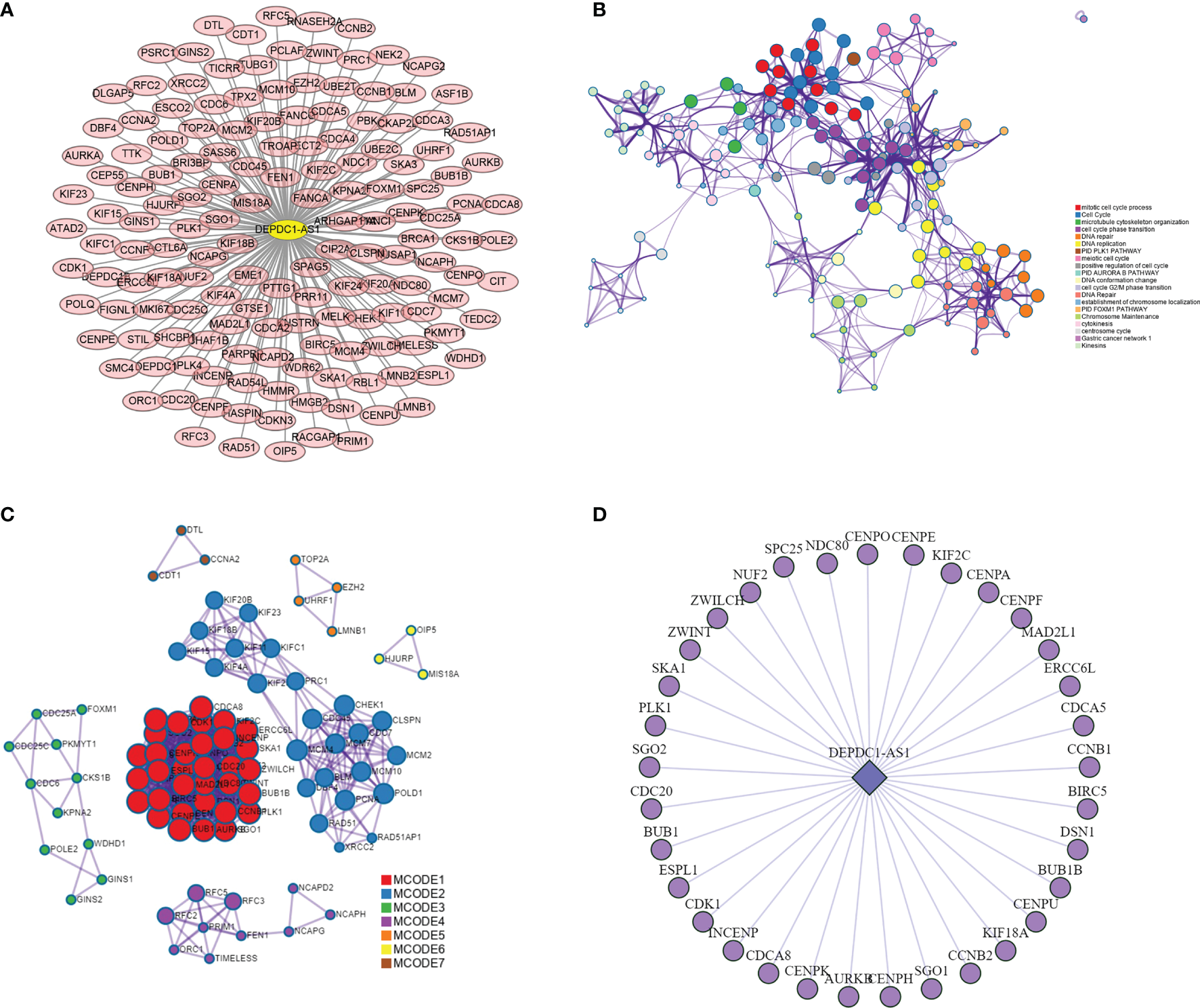 lncRNA-mRNA co-expression network and PPI network construction. [(A) lncRNA-mRNA co-expression network in the blue module; (B) protein-protein interaction network of co-expressed mRNAs in co-expression network; (C) MCODE plug-in screening out the highest-scoring sub-network; (D) co-expression network of lncRNA DEPDC1-AS1 and mRNAs in MCODE1].