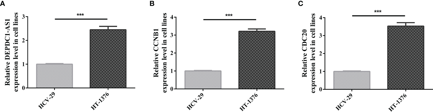 Total RNA was rooted in cells using TRIzol reagent (Invitrogen, CA, USA). RNA was reverse-transcribed to cDNA by PrimeScript RT Master Mix (Takara, Japan). RT-PCR analyses were performed using the 7500 Fast Real-Time PCR System (Applied Biosystems, Forster City, CA,USA) with the primers in Table 1. Data were explained by 2-∆∆Ct method and GAPDH was the internal reference of lncRNA DEPDC-AS1, CCNB1 and CDC20.