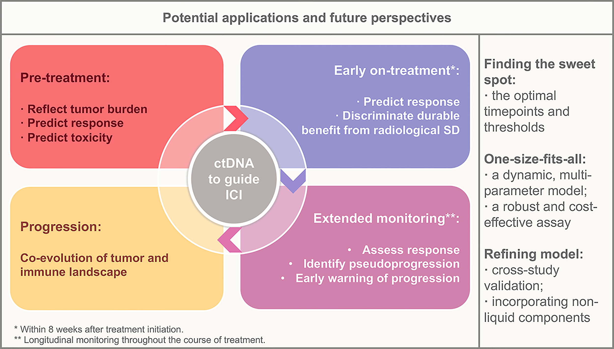 ctDNA heralds a revolution in the broader application of biomarker-directed ICI treatment. Early identification of therapeutic benefits and toxicity, as well as longitudinal noninvasive monitoring of therapeutic response and resistance in patients with ICI treatment, is an emerging approach to maximize the personalized benefit of ICIs. Although the current application of ctDNA in clinical practice remains limited, applications toward early identification of responders and response assessment are in the near future, and applications toward resistance monitoring and evolution tracking will be the next frontier (Figure 1).