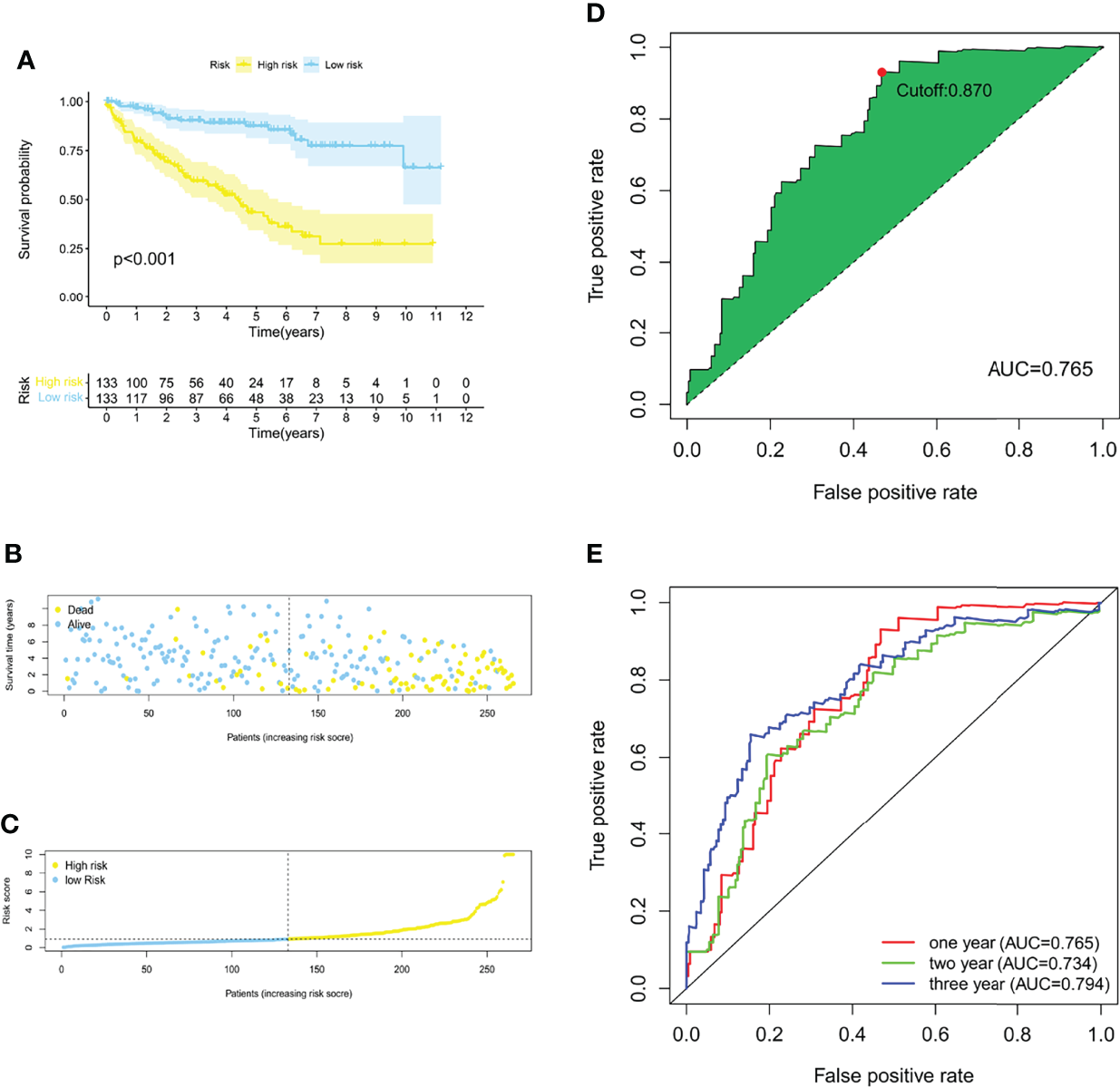 Figure 1 Construction of a risk score model of PRLs in the training group. (A) The Kaplan–Meier survival curves for the two risk groups in the training sets (p < 0.001). (B) The risk score plot of the training set. (C) Survival time and status of patients in the training set. (D, E) ROC curves at 1, 2, and 3 years, the AUC of the ROC curves, and the cutoff points for the risk model.