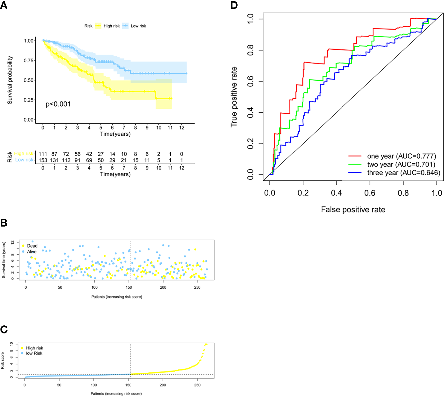 Figure 2 Validation of the model in the testing group. (A) The Kaplan–Meier survival curves for the two risk groups in the testing sets (p < 0.001). (B) The risk score plot of the testing set. (C) Survival time and status of patients in the testing set. (D) Time-dependent ROC curves of overall survival at 1, 2, and 3 years in the testing set.