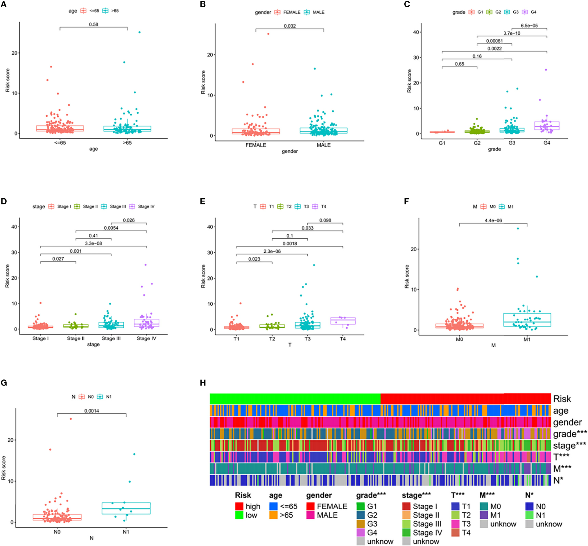Figure 3 Clinical characteristic evaluation by the risk assessment model. (A–G) Different clinical characteristics, including (A) age, (B) gender, (C) tumor stage, (D) clinical stage, (E) T stage, (F) M stage, and (G) N stage assessed by the risk model. (H) A hot plot of clinical characteristics and risk scores.