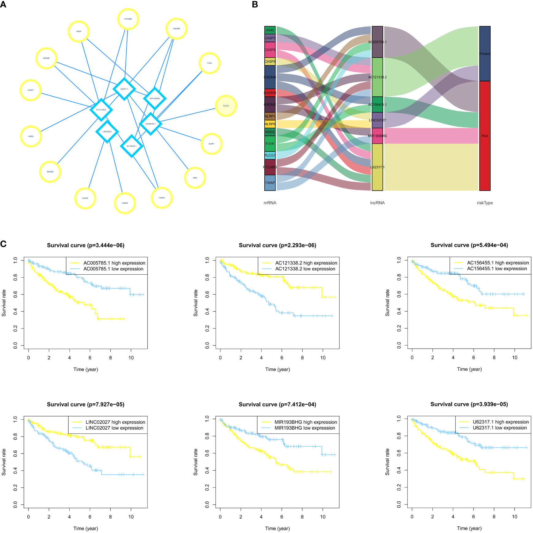 To examine the association between the expression level of each lncRNA in PRLncSig and the clinical outcomes, we constructed a Kaplan–Meier analysis and found that high expression of PRLncRNAs was correlated with poor prognosis of ccRCC patients (Figure 4C). We then conducted a lncRNA-mRNA coexpression network and visualized the result by using Cytoscape software version 3.8.2 (Figure 4A). Six lncRNAs and 14 pyroptosis-related mRNAs were used to build a coexpression network. The Sankey diagram showed the relationship between 15 lncRNAs and 21 pyroptosis-related mRNAs (Figure 4B).