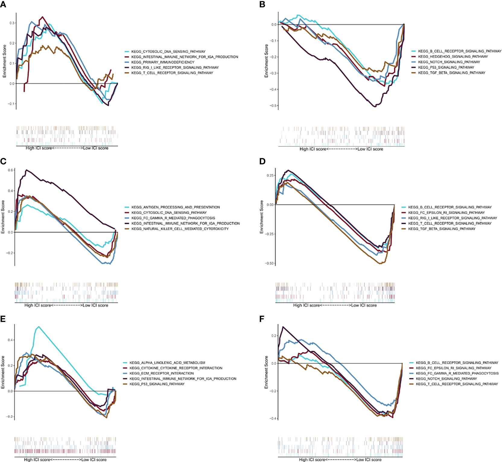 Figure 5 GSEA analysis. (A) The first five results of the enrichment plots of tumors with high-risk scores by GSEA in the training cohort. (B) The first five results of the enrichment plots of tumors with low-risk scores by GSEA in the training cohort. (C) The first five results of enrichment plots of tumors with high-risk scores by GSEA in the testing cohort. (D) The first five results of enrichment plots of tumors with low-risk scores by GSEA in the testing cohort. (E) The first five results of enrichment plots of tumors with high-risk scores by GSEA in the TCGA-KIRC cohort. (F) The first five results of the enrichment plots of tumors with low-risk scores by GSEA in the TCGA-KIRC cohort.