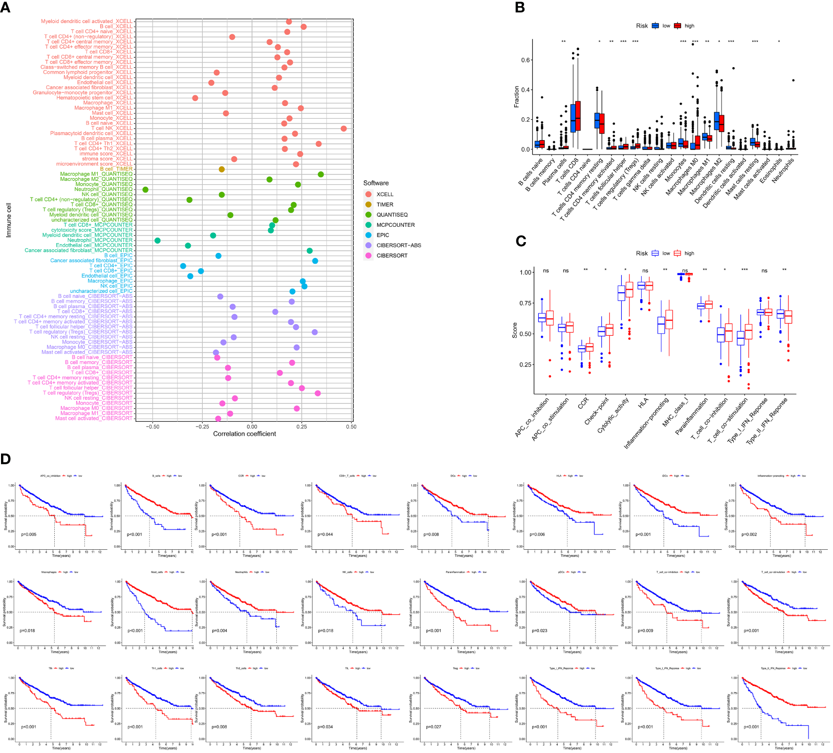 Figure 6 Correlation of immune microenvironment between risk scores. (A) Correlation analysis of the risk score and immune cells by XCELL, TIMER, QUANTISEQ, MCPCOUNTER, EPIC, CIBERSORT abs, and CIBERSORT algorithm. (B) Boxplot of CIBERSORT immune cell infiltrate analysis in TCGA-KIRC cohort. (C) Boxplot of immune function scores between high- and low-risk groups. (D) K-M curve of immune function between high- and low-risk groups (including APC coinhibition, B cells, CCR, CD8+ T cells, DCs, HLA, iDCs, inflammation-promoting, macrophages, mast cells, neutrophils, NK cells, parainflammation, pDCs, T-cell coinhibition, T-cell costimulation, Tfh, Th1 cells, Th2 cells, TIL, Treg, type I IFN response, type I IFN response, and type II IFN response).