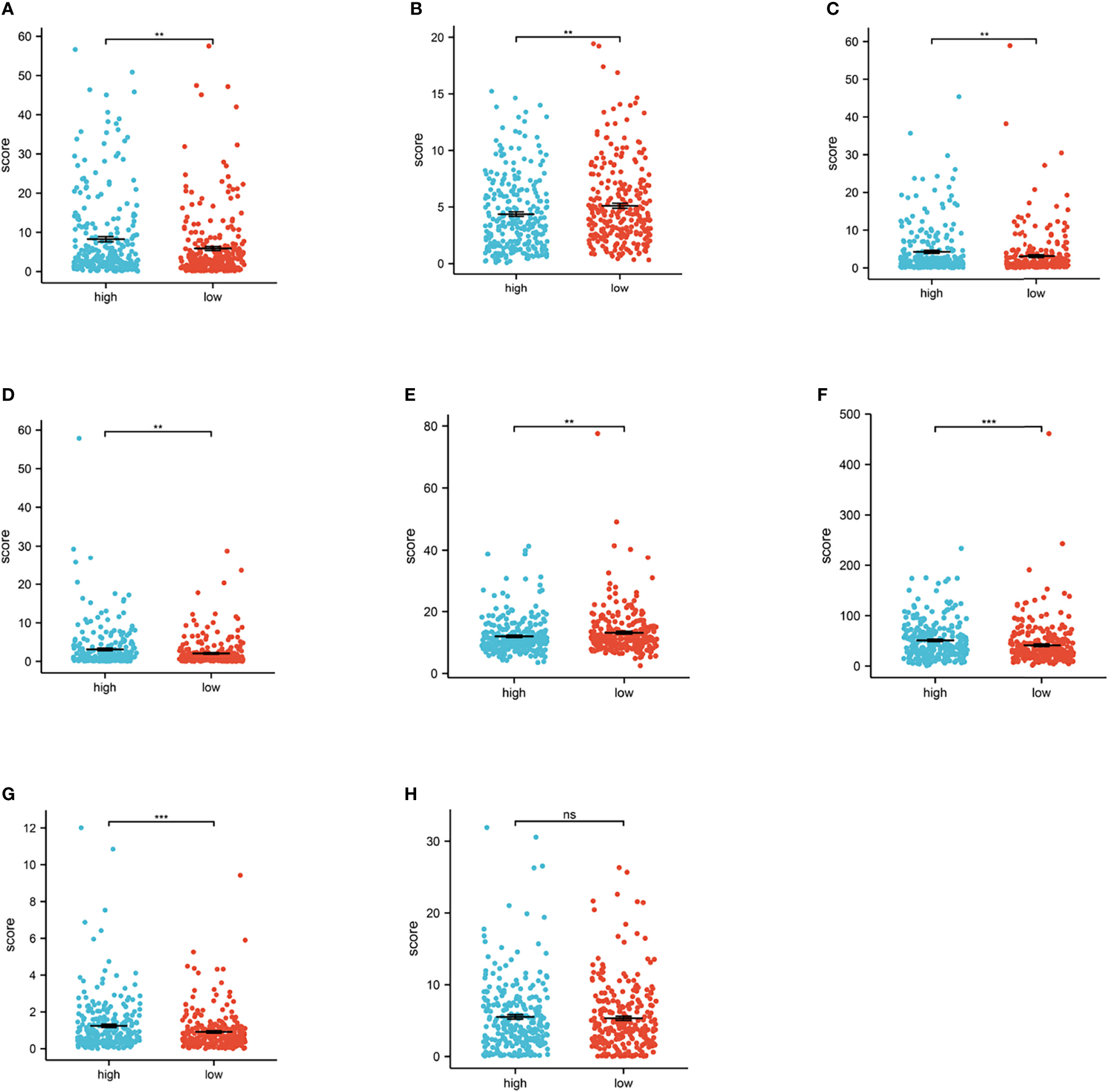 Figure 7 Relationship between risk score and immune checkpoint. (A–H) High-risk scores were positively correlated with high expression of CD27 (p < 0.01, Figure 6A), LAG3 (p < 0.01, Figure 6C), PDCD1 (p < 0.01, Figure 6D), and TNFRSF12A (p < 0.01, Figure 6F), TNFRSF18 (p < 0.001, Figure 6G) and low expression of CEACAM1 (p < 0.01, Figure 6B) and PVR (p < 0.01, Figure 6E), while TNFSF9 (Figure 6H) shows no statistical significance (*p < 0.0, **p < 0.001, ***p < 0.001).