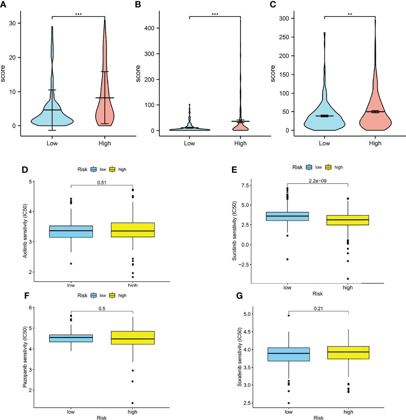 Figure 8 Immune-related biomarkers and drug response. (A) Aneuploidy scores of high- and low-risk groups (p < 0.001). (B) TCR (p < 0.001) and BCR (p < 0.01) scores of high- and low-risk groups. (D–G) Boxplots of estimated half-maximal inhibitory concentration (IC50) of the high- and low-risk groups for antitumor drugs: axitinib (D, p = 0.51), sunitinib (E, p < 0.001), pazopanib (F, p = 0.5), and sorafenib (G, p = 0.21) (*p < 0.0, **p < 0.001, ***p < 0.001).