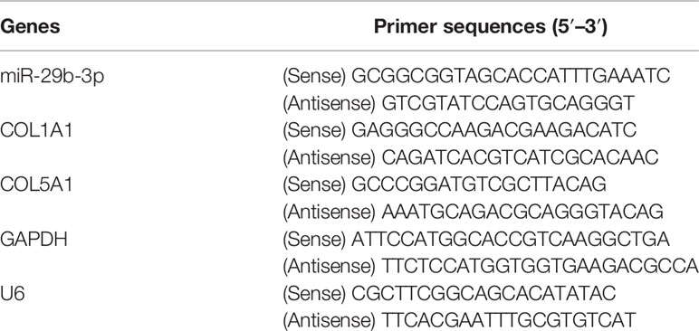 This study adopted a Fastpure Cell/Tissue Overall RNA Separation tool V2 (Vazyme, Nanjing, China) to extract all the RNAs and a reverse transcriptase tool (Vazyme, Nanjing, China) to prepare the cDNAs of COL5A1 and COL1A1 and miR-29b-3p; qRT-PCR was completed via the real-time fluorescent quantitation PCR equipment (ABI7500, America) with the SYBR qPCR Master Mix tool kit (Vazyme, Nanjing, China). The relative miR-29b-3p, COL1A1, and COL5A1 were identified via applying the 2−ΔΔCt formula, where U6 and glyceraldehyde 3-phosphate dehydrogenase (GAPDH) were regarded as the internal references. The sequences of the entire primers herein are shown in Table 1.