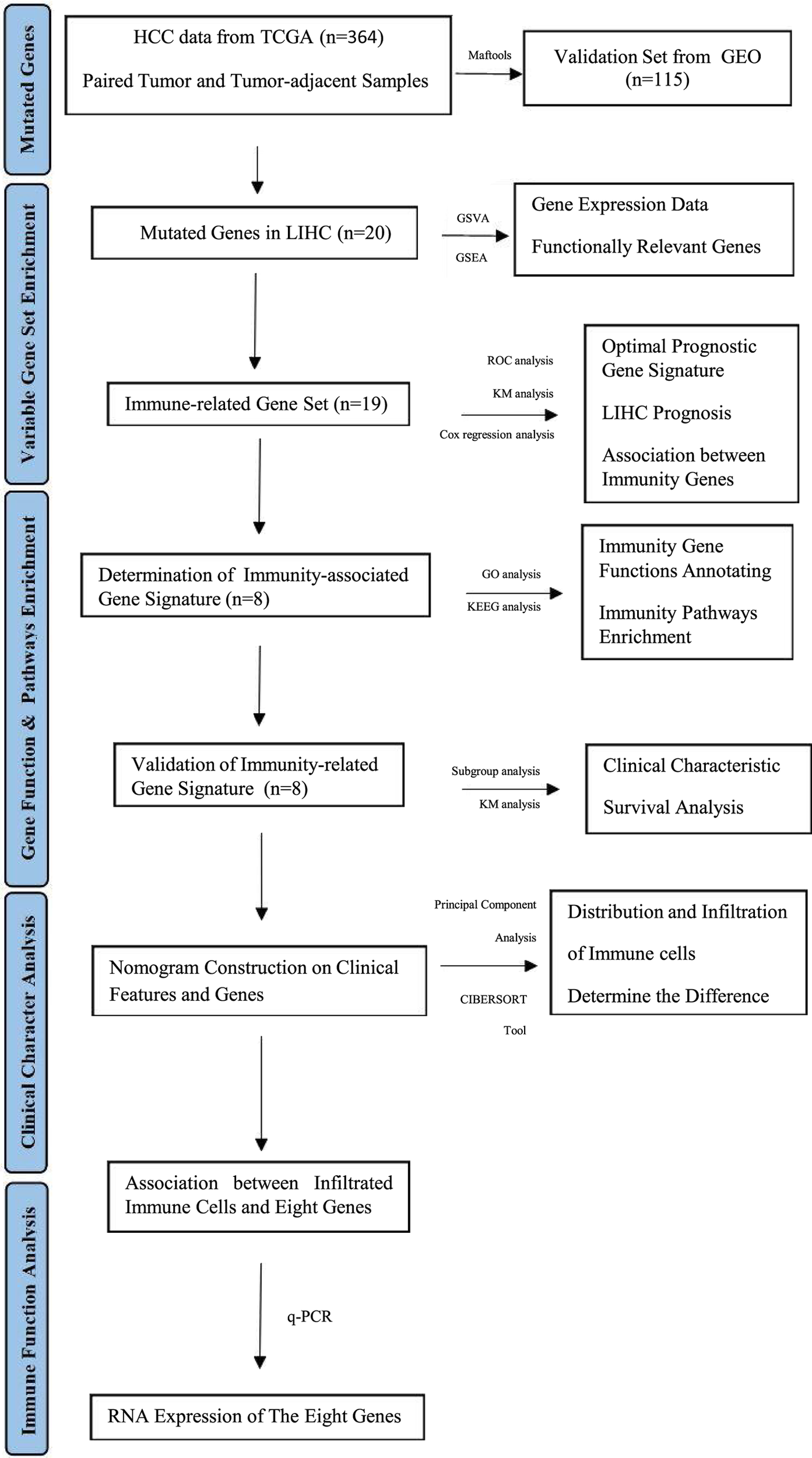 Hepatocellular carcinoma is the third most common cause of cancer-related deaths in China and immune-based therapy can improve patient outcomes. In this study, we investigated the relationship between immunity-associated genes and hepatocellular carcinoma from the prognostic perspective. The data downloaded from The Cancer Genome Atlas Liver Hepatocellular Carcinoma (TCGA-LIHC) and the Gene Expression Omnibus (GEO) was screened for gene mutation frequency using the maftools package. Immunity-associated eight-gene signature with strong prognostic ability was constructed and proved as an independent predictor of the patient outcome in LIHC. Seven genes in the immune-related eight-gene signature were strongly associated with the infiltration of M0 macrophages, resting mast cells, and regulatory T cells. Our research may provide clinicians with a quantitative method to predict the prognosis of patients with liver cancer, which can assist in the selection of the optimal treatment plan.