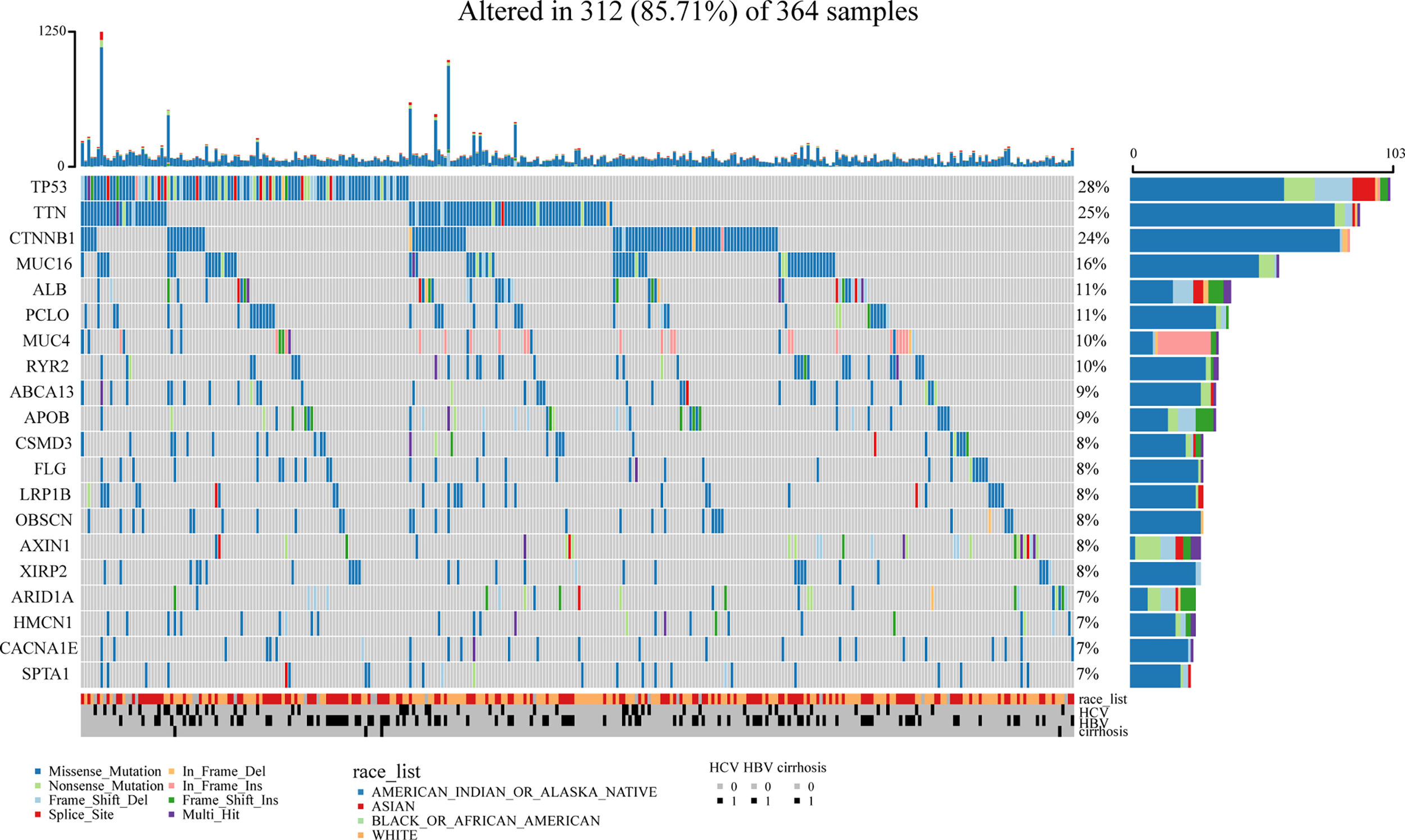 Identification of mutated genes. The maftools package was used and we identified the top 20 highly mutated genes in LIHC. TP53 had the highest mutation frequency among them.
