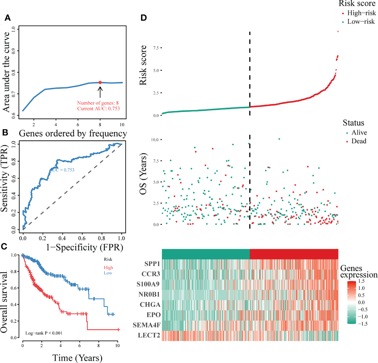 Construction of the optimal immune gene signature associated with LIHC prognosis. (A) Iterative Lasso Cox regression analysis used to construct the immune gene signature based on the size of the AUC. (B) ROC analysis of the optimal immunity-associated gene signature. (C) Kaplan-Meier curves of different risk groups. (D) The risk factor association diagram showing risk score distribution, survival status, and expression of the signature genes in the two risk groups.
