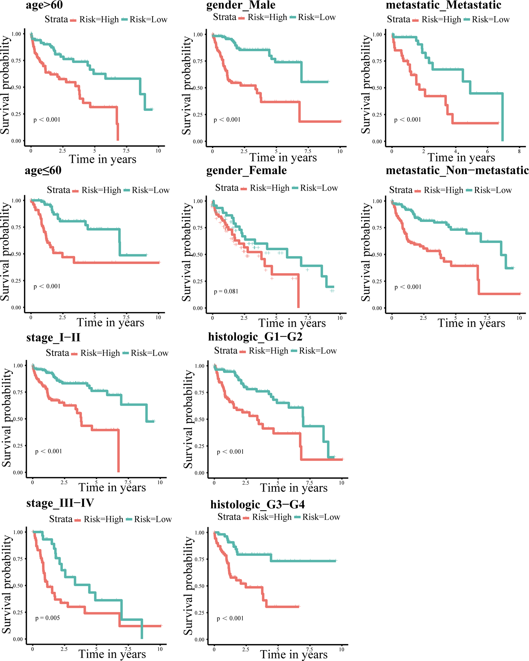 Kaplan-Meier survival analysis according to individual clinicopathological characteristics (age, gender, metastasis, and TNM and pathological staging). Red and green indicate high- and low-risk groups, respectively.