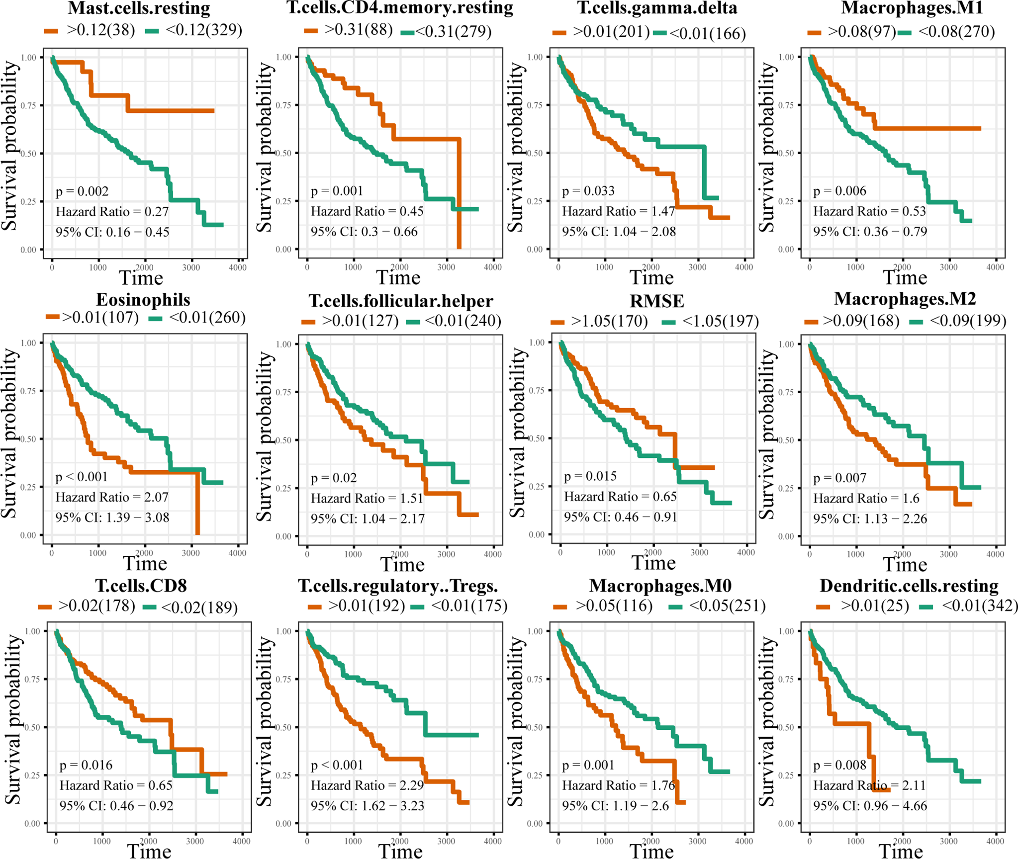 Correlation between immune cell infiltration and LIHC prognosis. Orange and green colours indicate the high- and low-risk groups, respectively.