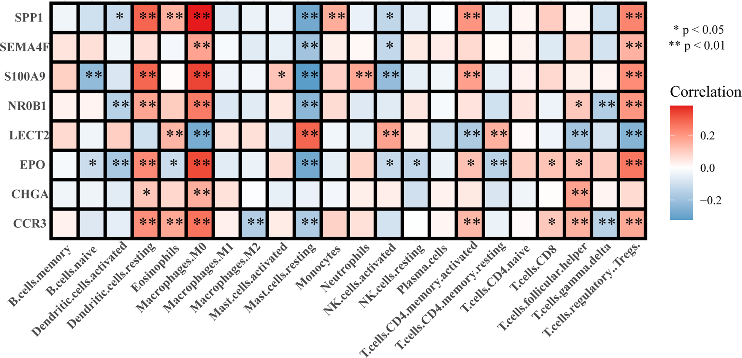 Analysis of the correlation between immune cell infiltration and prognosis showed that the infiltration of gamma delta T cells, eosinophils, and M0 and M2 macrophages indicated a poorer prognosis, whereas that of CD8+ T cells, M1 macrophages, and NK cells suggested a better prognosis for patients with LIHC (Figure 6). The results of the constructed correlation heat map for the signature genes revealed that M0 macrophages, resting mast cells, and Tregs showed negative correlation with CCR3, EPO, NR0B1, S100A9, SEMA4F, and SPP1, and positive correlation with LECT2 (Figure 7).