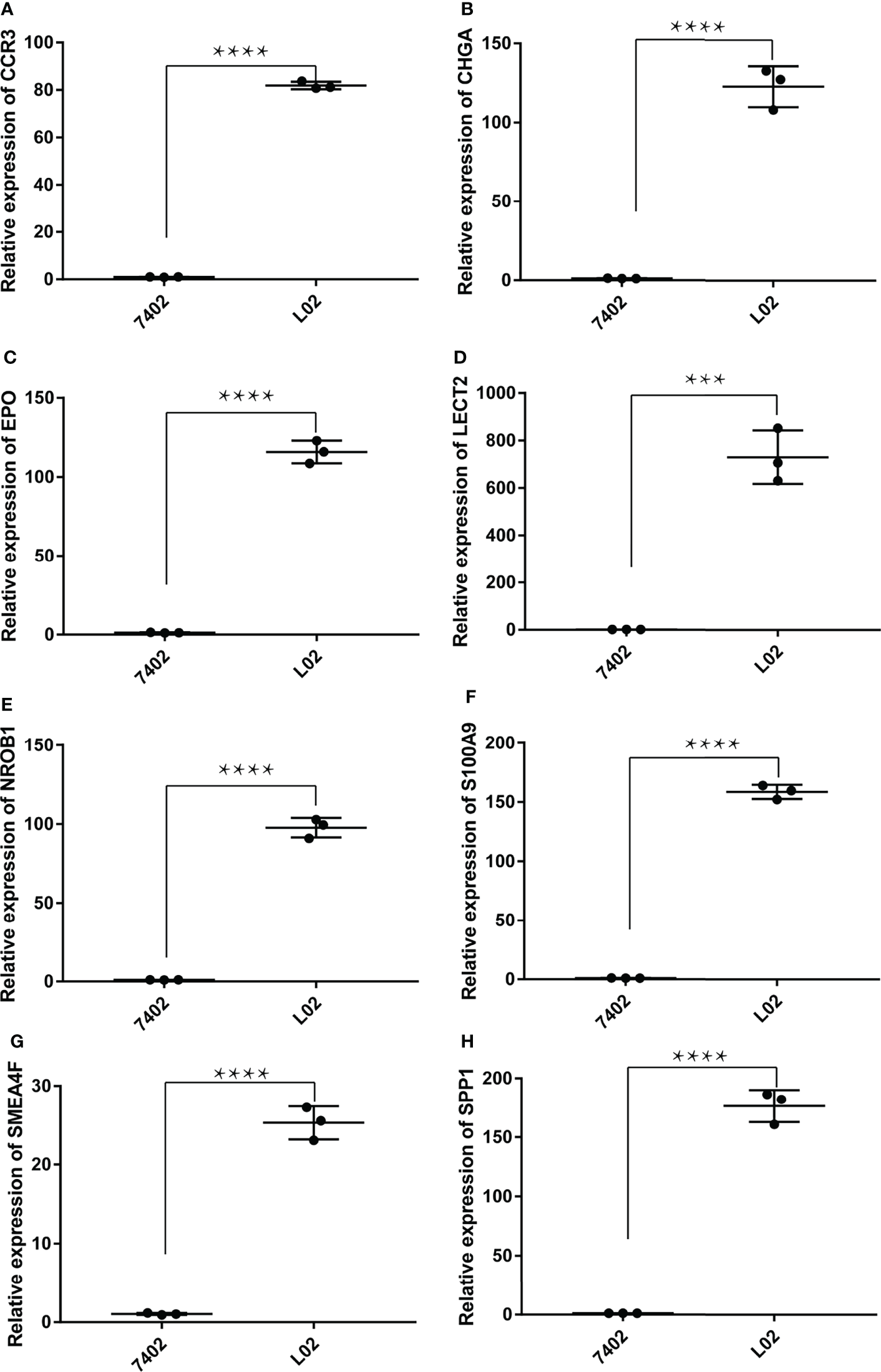 The relative RNA expression level of LECT2, SEMA4F, EPO, CHGA, NR0B1, S100A9, CCR3, and SPP1. The RNA expression of CCR3 (A), CHGA (B), EPO (C), LECT2 (D), NR0B1 (E), S100A9 (F), SEMA4F (G) and SPP1 (H) were low expressed in human hepatoma cells compared with normal human hepatic epithelial cells (Unpaired t-test, ***P < 0.001, ****P < 0.0001).