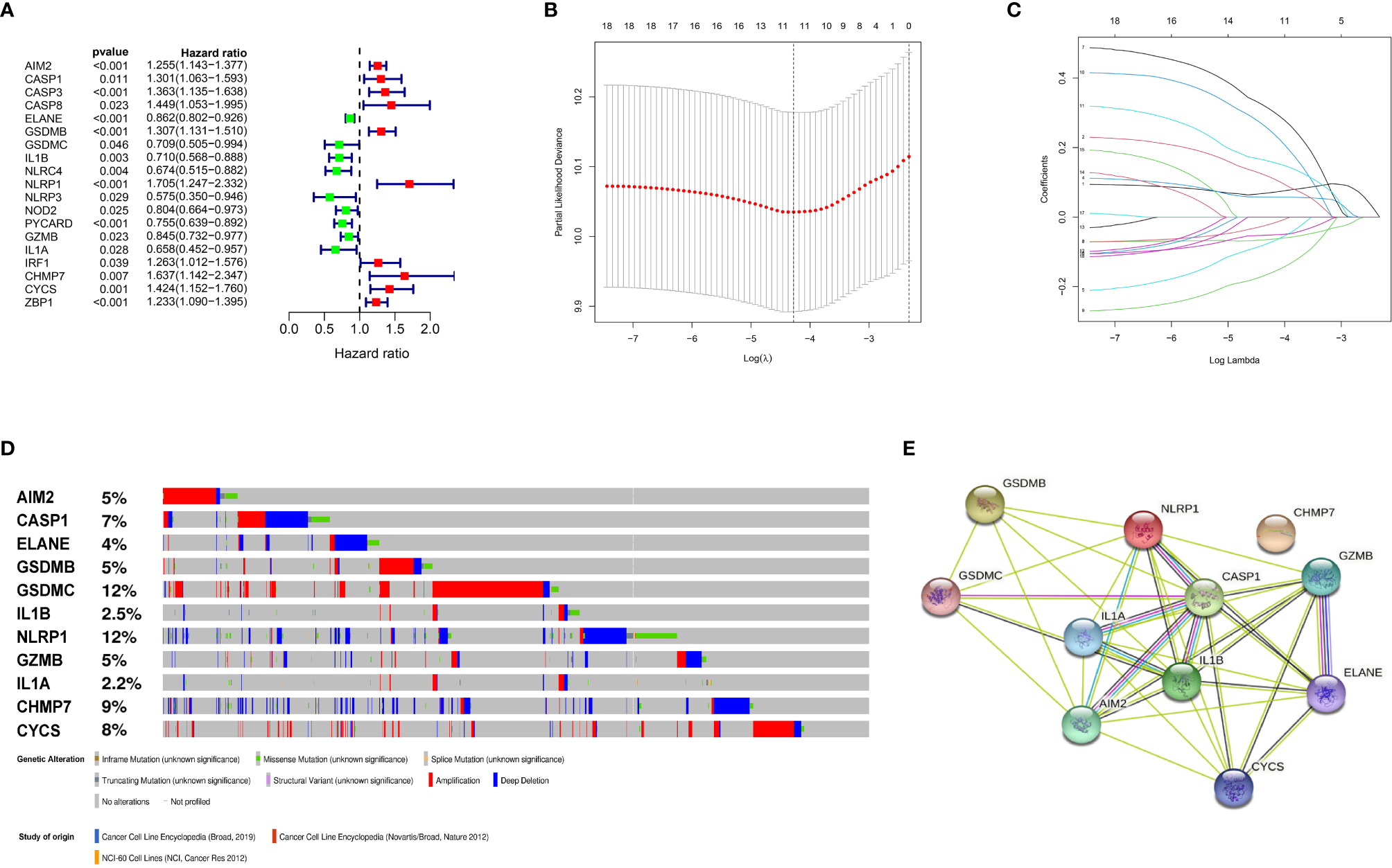 Construction and validation of the prognostic model. (A) Forest plots showing the results of the univariate Cox analysis between gene expression and OS. (B) 100000 bootstrap replicates by lasso regression analysis for variable selection. (C) LASSO coefficients of IRGs. (D) Genetic alterations of the 11 IRGs in CCLE. (E) The protein-protein interactions between the model related proteins and the other proteins.
