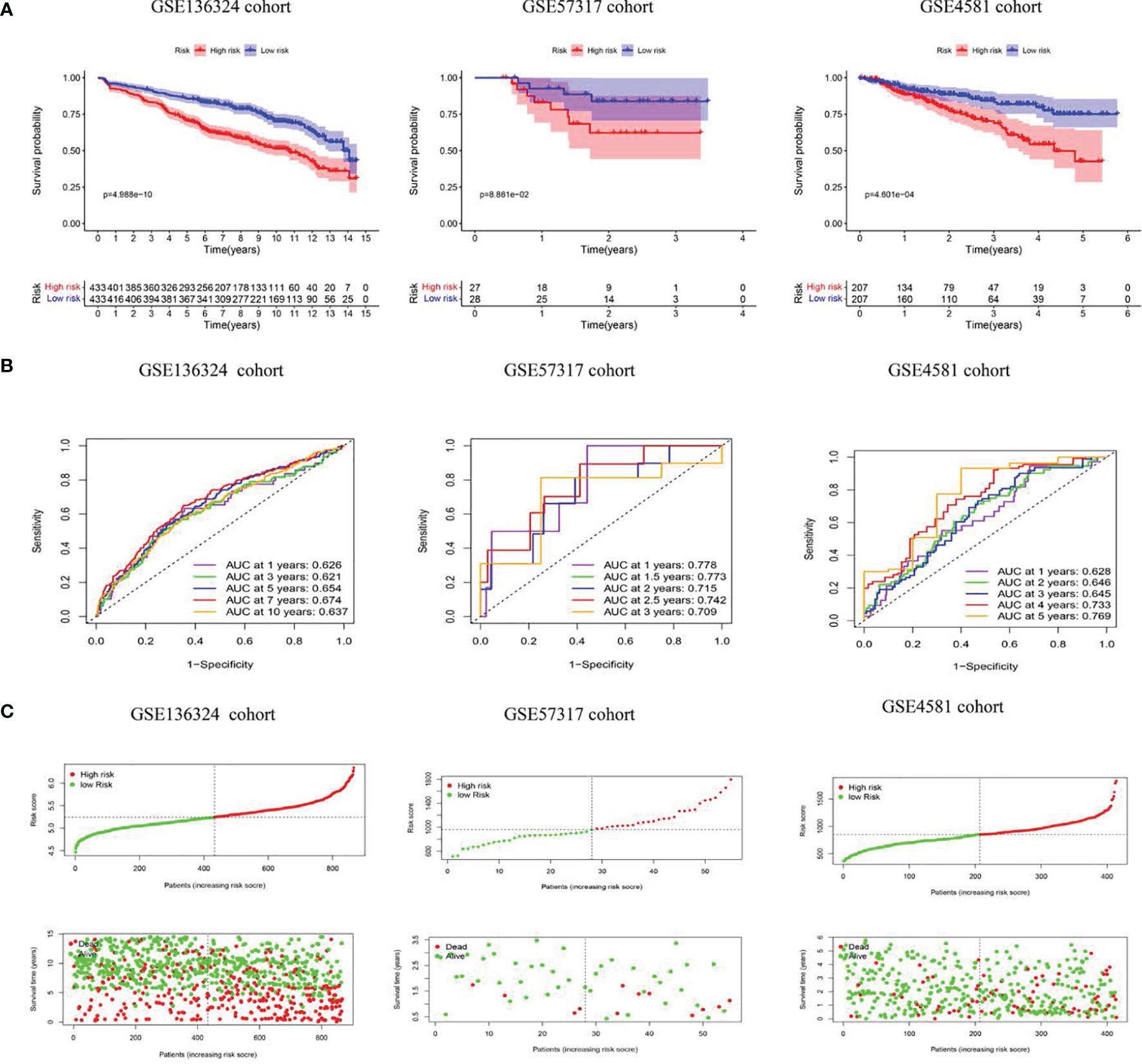 The TC patients were assigned to high-risk (HR, n=433) or low-risk (LR, n=433) populations, according to the median threshold. LR patients experienced remarkably prolonged OS time, relative to HR patients (P<0.05) (Figure 3A). Next, we tested the model reliability with time-dependent ROC curves. The TC AUCs for the 1-, 3-, 5-, 7-, and 10-year OS were 0.626, 0.621, 0.654, 0.674, and 0.637, respectively (Figure 3B). The VC RS was computed based on the aforementioned formula, and the median TC RS was used as the threshold. The curves were next applied to the internal VC, and the subsequent AUCs were 0.778 and 0.715, 0.709 and 0.628, as well as 0.645 and 0.769 for the 1-, 3- and 5-year OS in the GSE57317 and GSE4581 populations, respectively. The PRG signature exhibited an elevated OS predictive accuracy in both VCs. Moreover, the HR patient OS was remarkably worse than the LR patient OS, as evidenced by the Kaplan-Meier analysis. Given these data, our model demonstrated persistent superior performance.