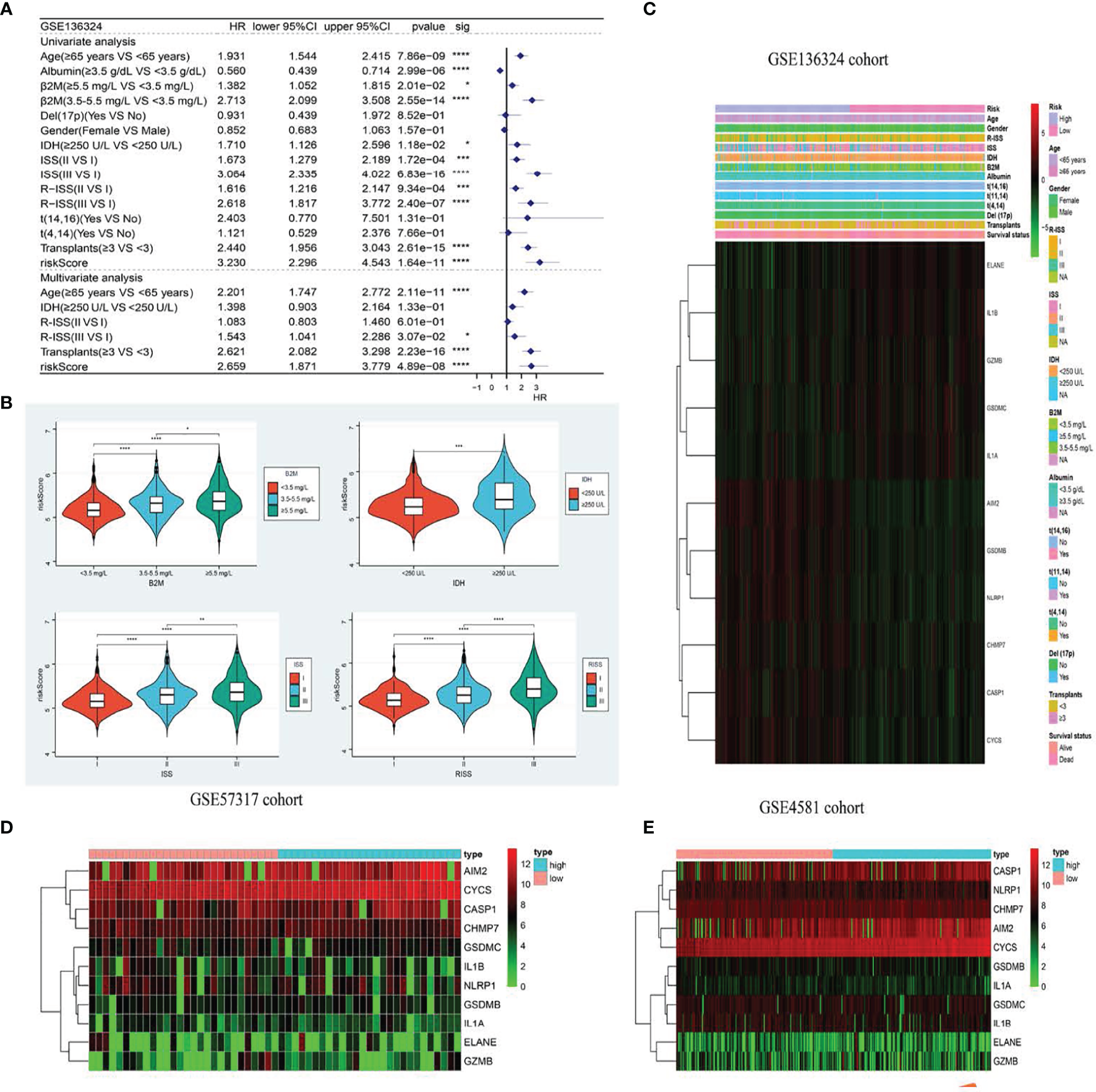 The model is significantly correlated with clinicopathological factors in MM patients and validates survival prediction. (A) Univariate (top) and Multivariate(bottom) COX analysis in training cohort. (B) The the relationship between clinical features and risk groups in training cohort. (C–E). The heatmap displays results for the clinical. *p < .05; **p < .01, ***p < .001 and ****p < 0.0001.
