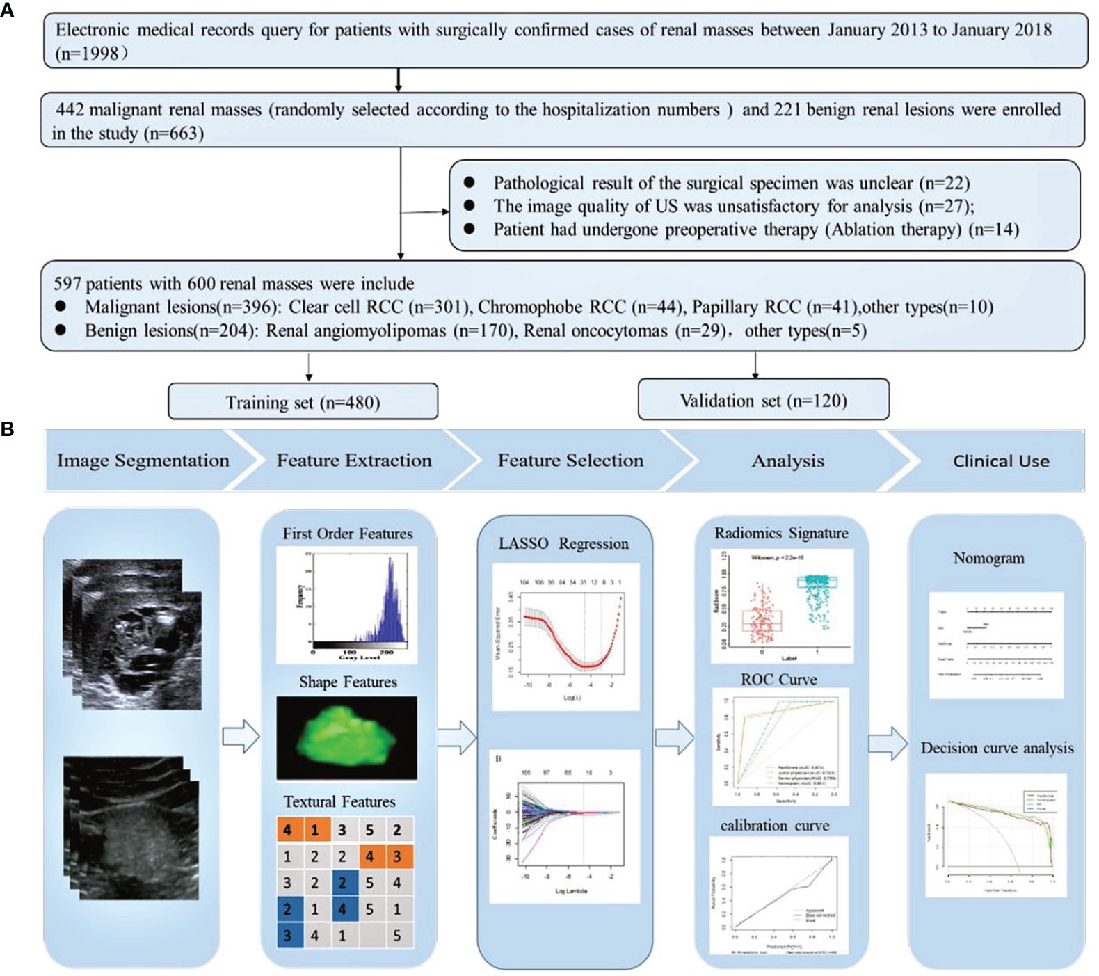 Conventional B-mode ultrasound (US) is an easy, safe, and non-invasive procedure. It is currently the first-line imaging modality for detecting renal lesions and discriminating benign from malignant renal tumors. However, the visual interpretation of US images is generally based on the sonographers’ experience. Radiomics features can be computed from grayscale images to reflect the texture and morphology of tumors (8–11). Based on US images, radiomics has been applied to evaluate various tumors, including hepatocellular carcinomas, breast cancer, and thyroid carcinomas (12–15). However, to the best of our knowledge, no published study has applied ultrasonic-based radiomics to renal tumors. The purpose of this study was to develop and validate an ultrasonic-based radiomics nomogram for the differentiation between benign and malignant solid renal masses.
