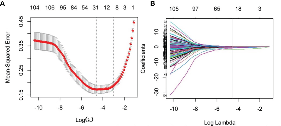 Feature selection using the least absolute shrinkage and selection operator (LASSO) binary logistic regression model. (A) Tuning parameter (lambda) selection in the LASSO model used 10-fold cross-validation via minimum criteria. (B) The gray line in the figure is the partial likelihood estimate corresponding to the optimal value of lambda. The optimal lambda value of 0.061 was chosen.