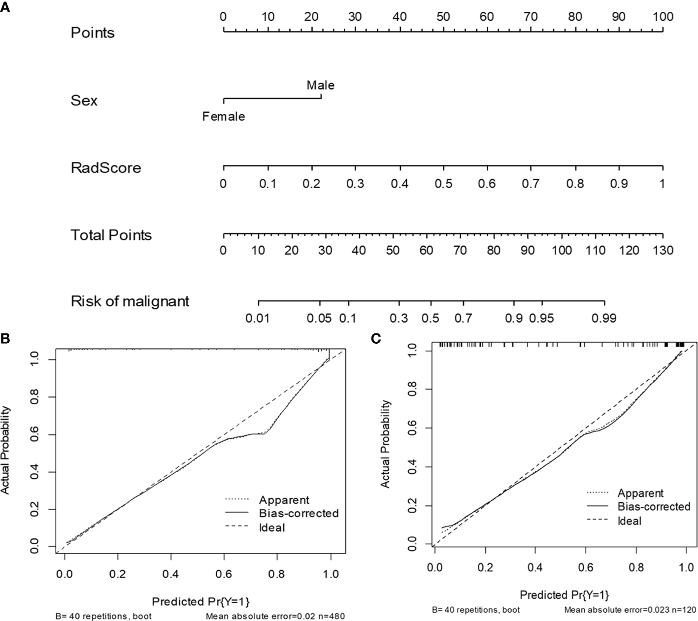 The radiomics nomogram and calibration curves for the radiomics nomogram. The radiomics nomogram, combining sex and RadScore, developed in the training set (A). Calibration curves for the radiomics nomogram in the training (B) and validation (C) sets.