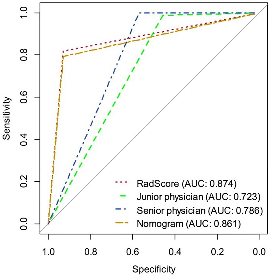 Table 2 and Figure 5 show the diagnostic performance of the radiomics signature, radiomics nomogram, and senior and junior physicians in the validation set. There was a significant difference between the junior physician and the radiomics nomogram (DeLong p = 0.004), but there was no significant difference between the senior physician and the radiomics nomogram (DeLong p = 0.089). However, the specificity of the radiomics nomogram was significantly higher than that of the senior and junior physicians (0.93 vs. 0.57 vs. 0.46).