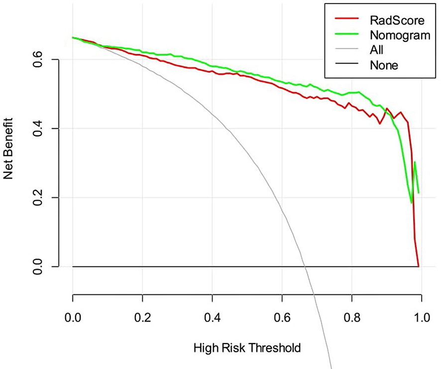Decision curve analysis for two models. The y-axis indicates the net benefit; the x-axis indicates threshold probability. The red line and green line represent net benefit of the radiomics signature and the radiomics nomogram, respectively.