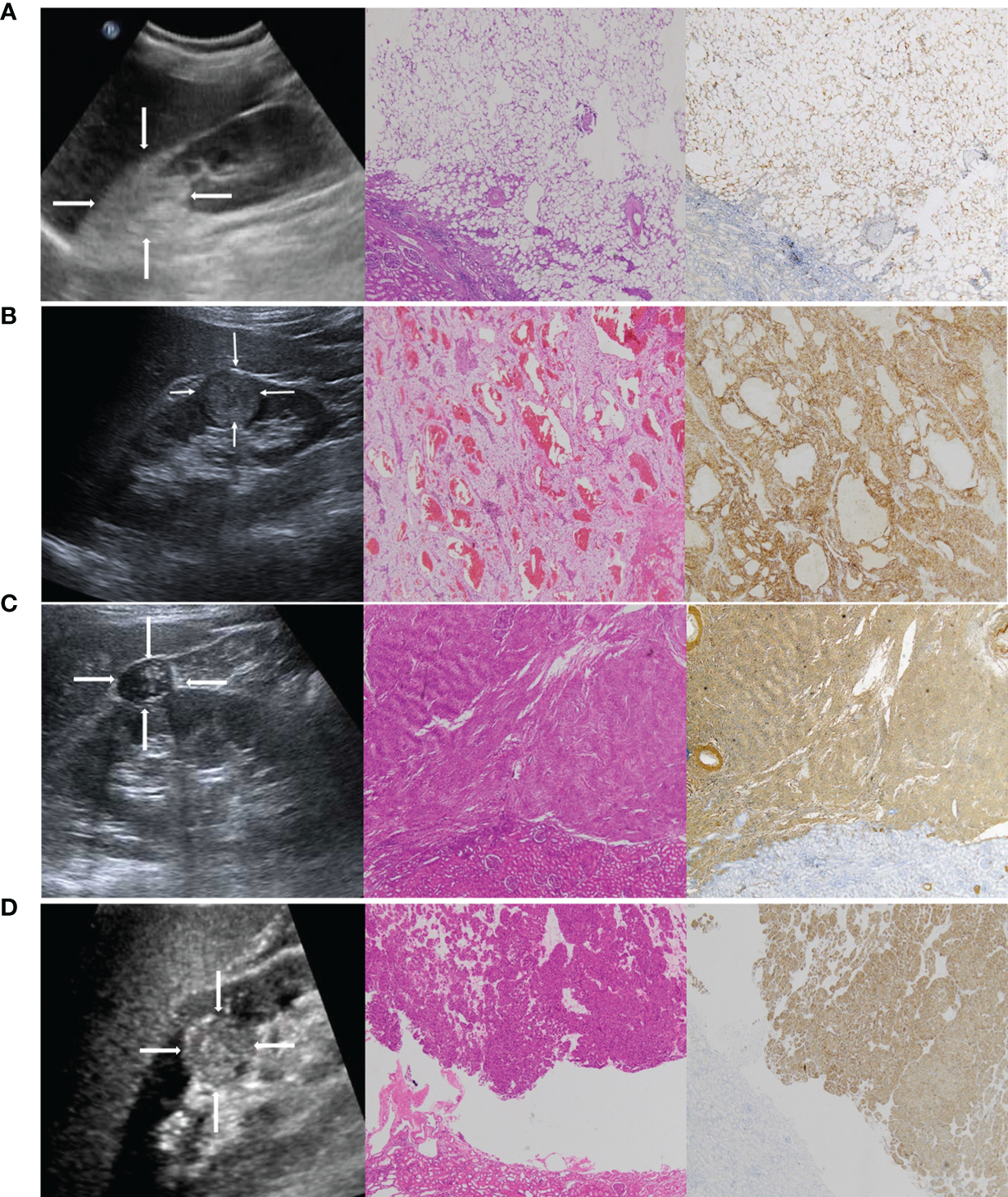 (A) A 42-year-old female patient with a strong hyperechoic tumor in the upper pole of the right kidney; the pathology report showed angiomyolipoma (AML). Representative ultrasound image (left). The echogenicity corresponds with a composition of fat. The pathological H&E staining image (middle, ×50) showed that the tumor was mainly composed of fat. S-100 immunohistochemical staining image (right, ×50) was used to label the lipid composition. (B) A 65-year-old male patient with a hypoechoic tumor located in the lower middle of the right kidney; the pathology report showed clear cell RCC. Representative ultrasound image (left). The pathological H&E staining image (middle, ×50). CA-IX immunohistochemical staining image (right, ×50) was used to label the clear cell RCC. (C) A 51-year-old female patient with a hypoechoic tumor located in the upper middle of the right kidney; the pathology report showed AML without visible fat. It was misdiagnosed as RCC by a sonographer. Representative ultrasound image (left). The pathological H&E staining image (middle, ×50) showed that the tumor was mainly composed of smooth muscle. SMA immunohistochemical staining image (right, ×50) was used to label the smooth muscle composition. (D) A 47-year-old female patient with a hypoechoic tumor located in the middle of the right kidney; the pathology report showed oncocytoma. It was misdiagnosed as RCC by a sonographer. Representative ultrasound image (left). The pathological H&E staining image (middle, ×50). CD117 immunohistochemical staining image (right, ×50) was used to label the oncocytoma.