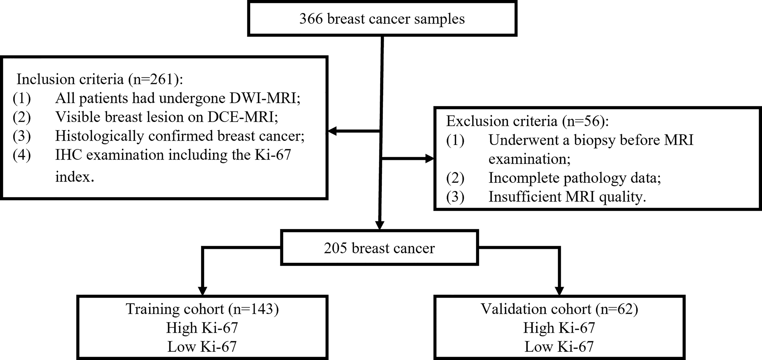 Between December 2018 and September 2020, 366 patients with pathologically confirmed primary BC who underwent breast DCE-MRI at Shengjing Hospital were enrolled in the study. Figure 1 shows the patient recruitment process for this study. The inclusion criteria were as follows. All included patients 1) underwent DWI-MRI, 2) had clear breast lesions on magnetic resonance images, 3) had BC confirmed through histologic examination, and 4) underwent IHC examination, including the Ki-67 index. The exclusion criteria were as follows. The excluded patients 1) underwent biopsy before MRI, 2) had incomplete pathological data, or 3) had insufficient MRI quality because of clear motion artifacts.