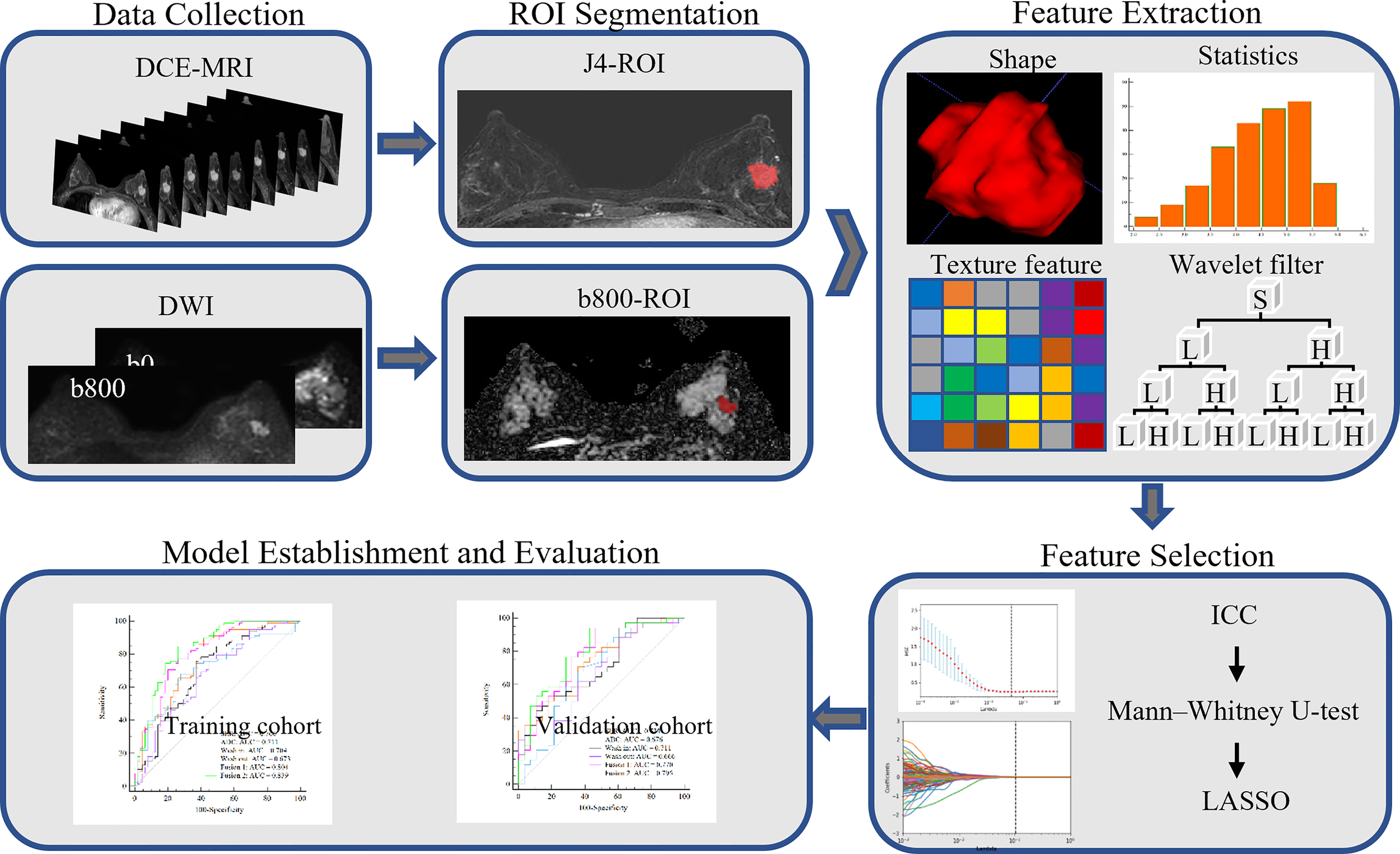 Prior to feature selection, we calculated the intra-class correlation coefficients (ICCs) to evaluate the reproducibility and stability of radiomics features extracted from segmented images performed by two experienced radiologists. Features with a good consistency (ICC > 0.8) were retained for further radiomics analysis.