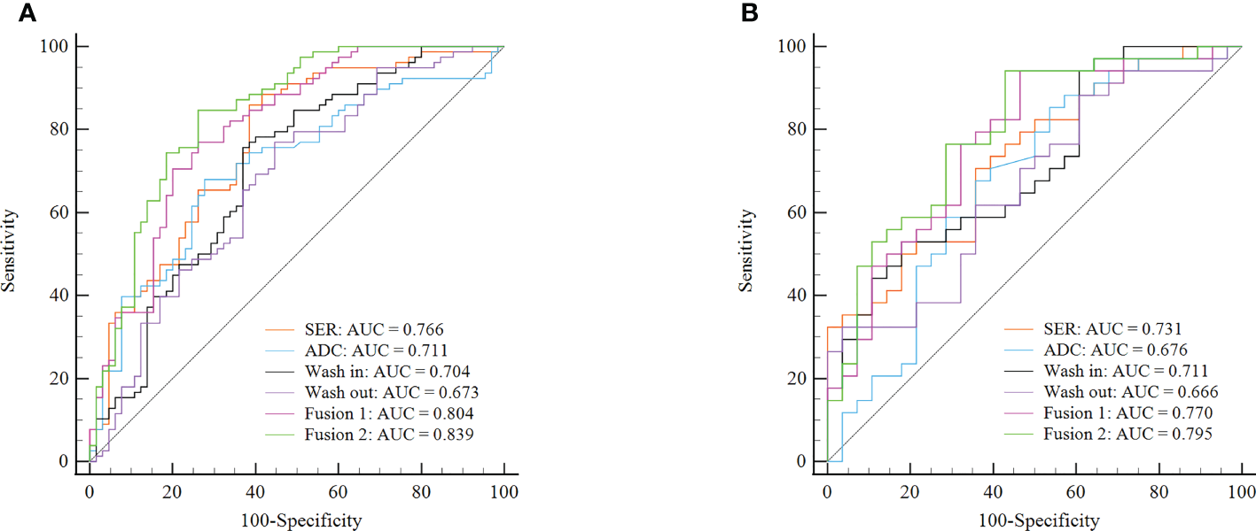 To perform Ki-67 status recognition, five, four, six, and one features were selected from the wash-out, wash-in, SER, and ADC maps, respectively, and 14 and 15 features were selected from two combined parameter maps (DCE-MRI parameter maps and DCE-MRI combined with ADC maps, respectively). The details of the 15 features selected from the combined DCE-MRI and ADC maps are shown in Table 2. The feature details selected from other maps are shown in Supplementary Tables 2–5. We then established six support vector machine classifiers to predict Ki-67 status according to the final retained features. The performance of the classifiers was evaluated on the basis of ROC curves, and the results are presented in Figure 4. Classifiers containing features extracted from a wash-out, wash-in, SER, and ADC maps were evaluated. After the addition of the features of ADC maps, the performance of the model combined with the three parameter maps improved, and the AUC value was 0.839 (95% CI, 0.768, 0.895) in the training set and 0.795 (95% CI, 0.674, 0.887) in the validation set (Table 3). In addition, compared with that of the single parameter image, the predictive performance of the support vector machine (SVM) model in the training dataset was significantly improved by combining the features of each map (i.e., wash-out, wash-in, SER, and ADC maps) (p< 0.001; p = 0.001, 0.001, 0.002). The performance of the combined model in the validation data set was higher than that of the model based on the SER parameter maps (p = 0.040; Table 4).