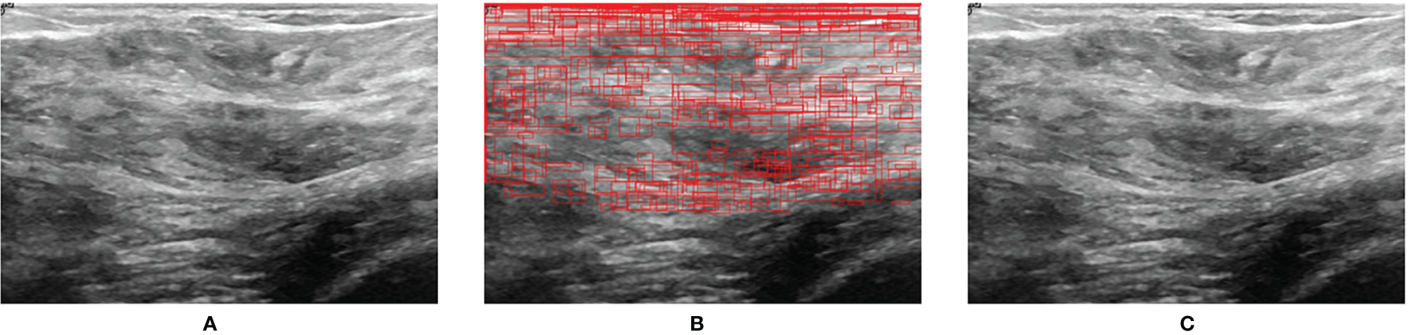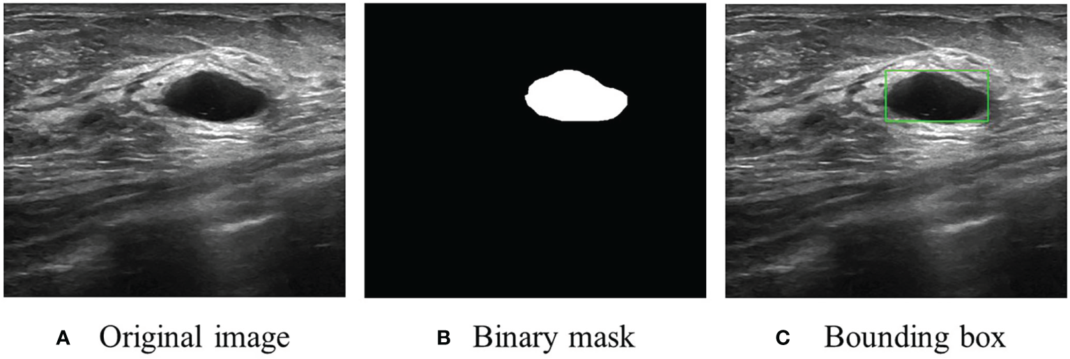 An US image sample. (A) Original image. (B) Original segmentation ground truth in binary mask form provided by (22). (C) Conversion to bounding box as the ground truth for RoI detection and localization.