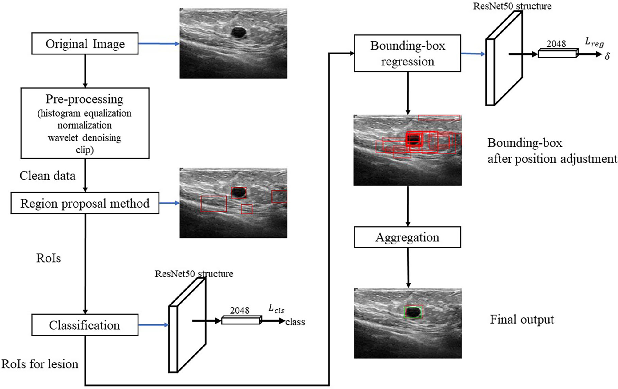 Figure 2 shows the algorithm. RoI candidates are screened out by a preprocessing method and an unsupervised region proposal method. The classification and bounding-box regression networks were constructed for the RoI candidates. We select all the RoI candidates with the probability of being lesion higher than 0.9 according to (23) and adjust their position with bounding-box regression. Finally, we aggregate these bounding boxes and achieve the final output.