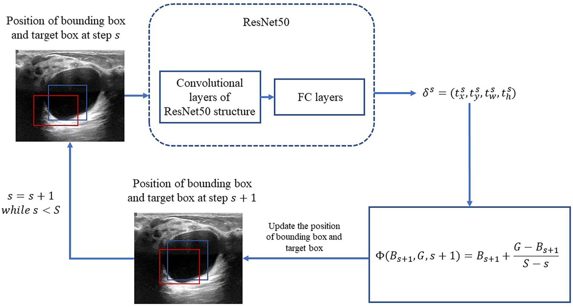 In the following, the RoIs classified as lesions are denoted as bounding box and used as the input of the bounding-box regression. The procedure is illustrated in Figure 3. Because ResNet50 has been proven to be competent for the feature extraction of breast US images (25), we use ResNet50 as the backbone network for the bounding-box regression.