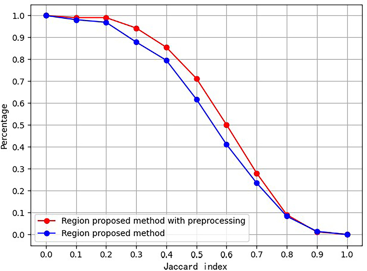 An ablation study was conducted to prove the effect of the proposed preprocessing method. Figure 4 is the ablation study result. The vertical axis is the ratio of images, whose Jaccard index measuring RoI and ground truth exceeds the corresponding abscissa value.