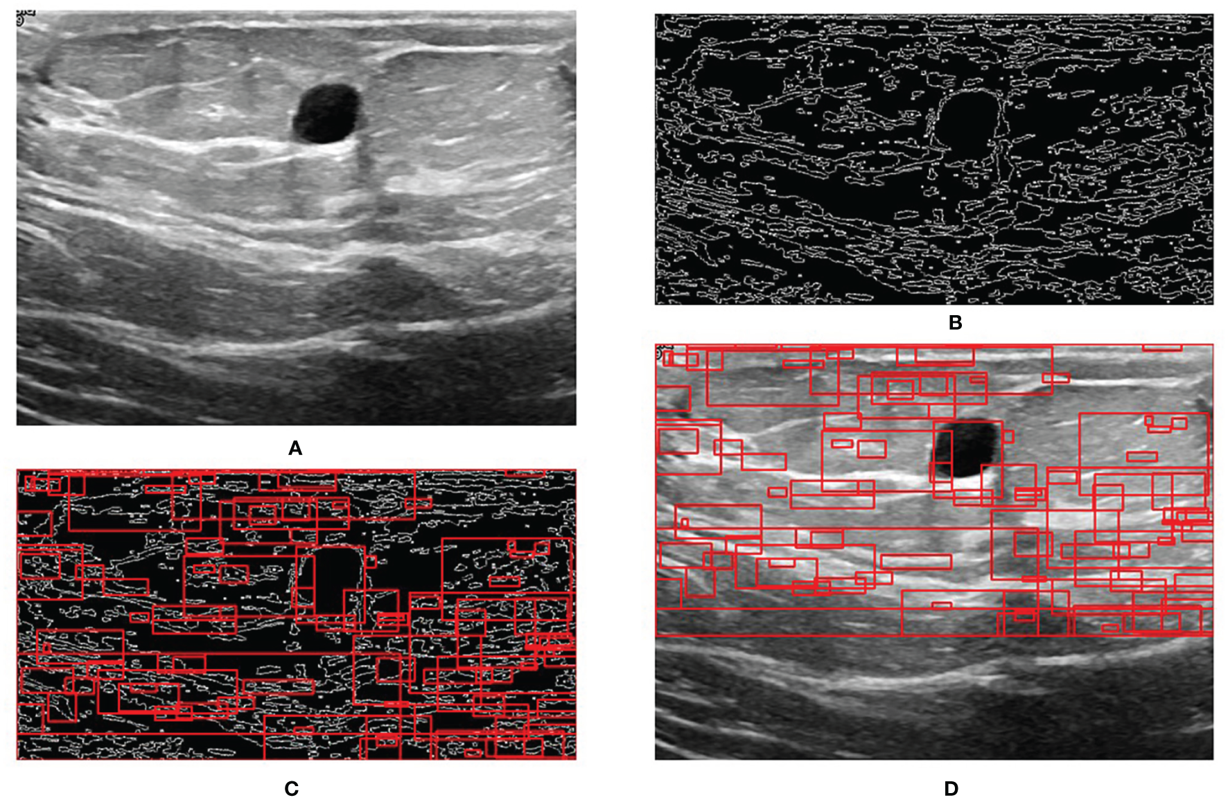 Step-by-step process of RoI extraction. (A) Original image. (B) Edges obtained by Canny edge detector. (C) RoIs obtained by selective search. (D) RoIs on the original image.