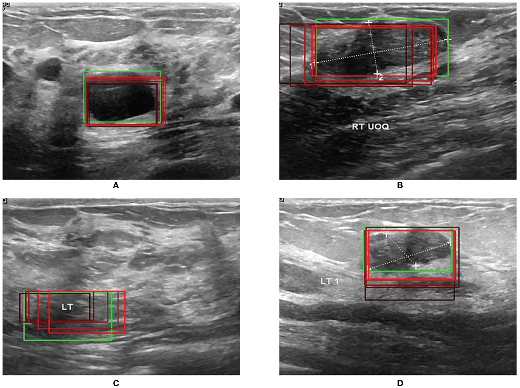 Classification estimates the label for the entire image (9). constructed CNN to classify the US images into benign and malignant breast tumors. CNN was further improved by introducing a matching layer for breast mass classification (10). The support vector machine, VGG, and ResNet were also applied to the classification issues for the breast US images (11–13). Object detection can automatically identify the specified targets in the images (12). used VGG and ResNet for the classification and lesion detection for US images (14). evaluated the performance of detecting breast cancer lesions in US images for three deep learning models. Segmentation is used for the further precise measurements and structures of targets (15). proposed a U-net-based segmentation algorithm for suspicious breast masses in US images. Object detection can offer more detailed information than classification (16) and can also save more costs of labeling data and training networks than segmentation (17). For these reasons, object detection is often used for the breast disease lesion identification for US images, which can help the radiologist make a diagnosis efficiently with expected high sensitivity and specificity (14).