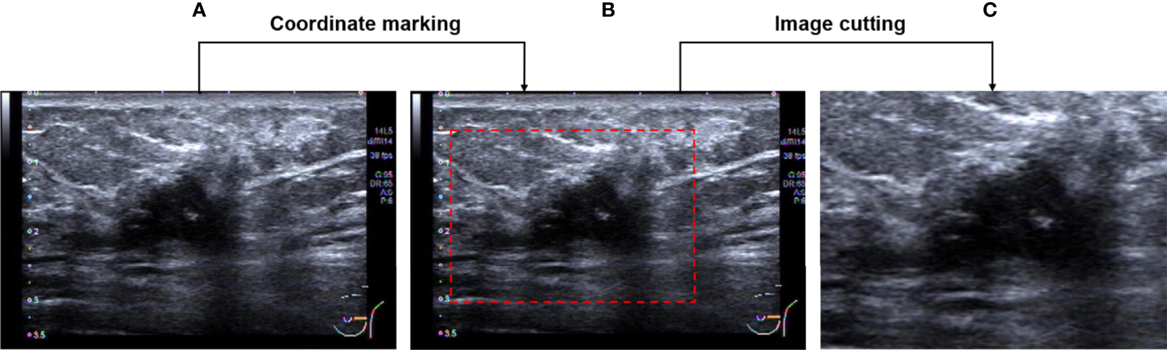 Image pre-processing. (A) An original breast US image. (B) Image after coordinate marking. (C) The selected effective image area.