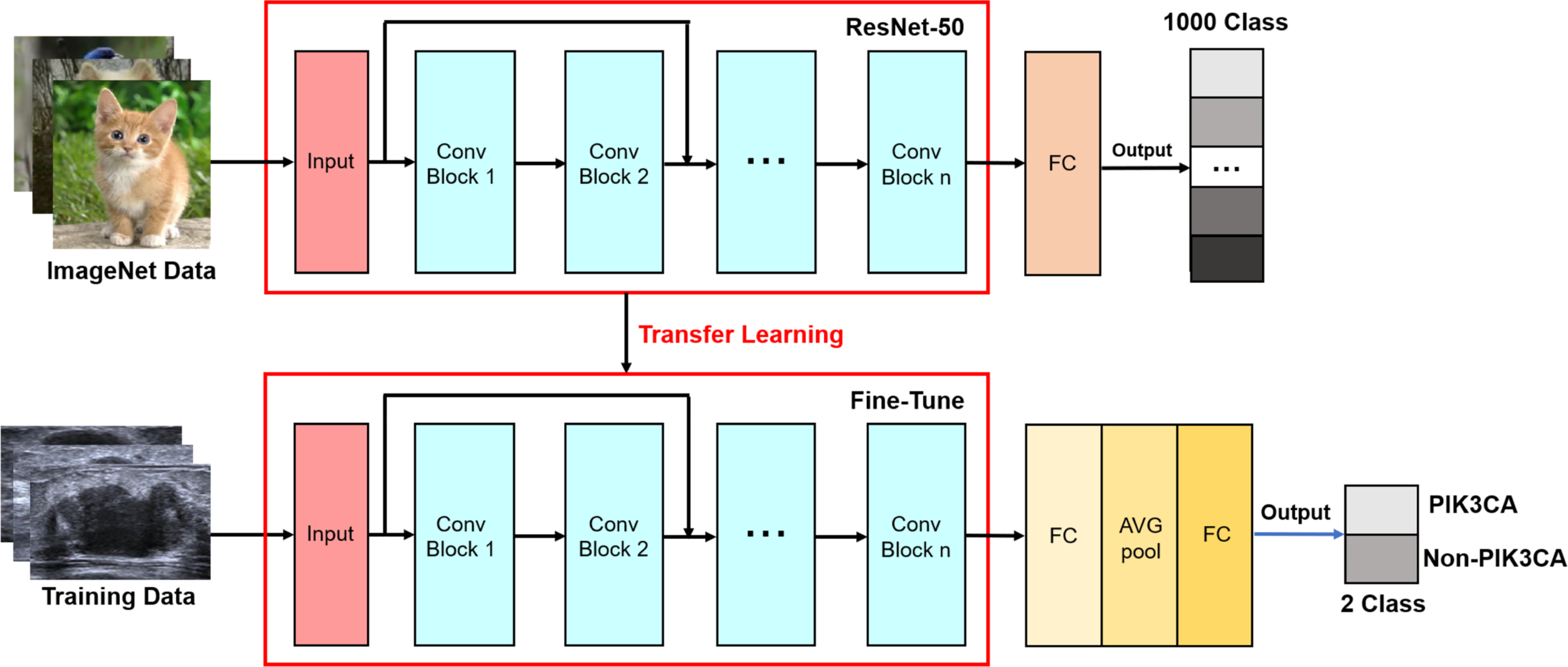 In the proposed method, the PIK3CA mutation status is observed on the ROI images and the mutation identification problem is transferred into an image classification problem. A deep residual network (ResNet) is redesigned by changing the architecture to extract the textural features on images and its output parts were modified to accomplish this classification task.