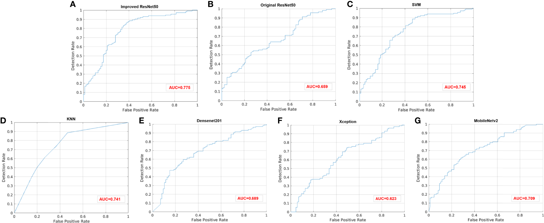 ROC curves of different models. (A) Improved ResNet50. (B) Original ResNet50. (C) SVM. (D) KNN. (E) DenseNet201. (F) Xception. (G) MobileNetv2.