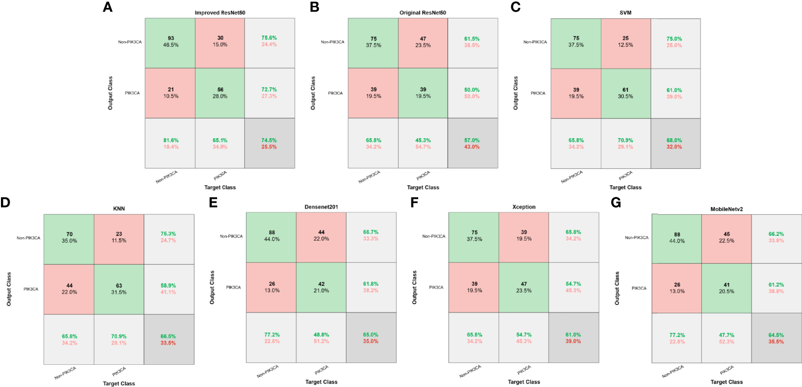 Confusion matrices of different models. (A) Improved ResNet50. (B) Original ResNet50. (C) SVM. (D) KNN. (E) DenseNet201. (F) Xception. (G) MobileNetv2.