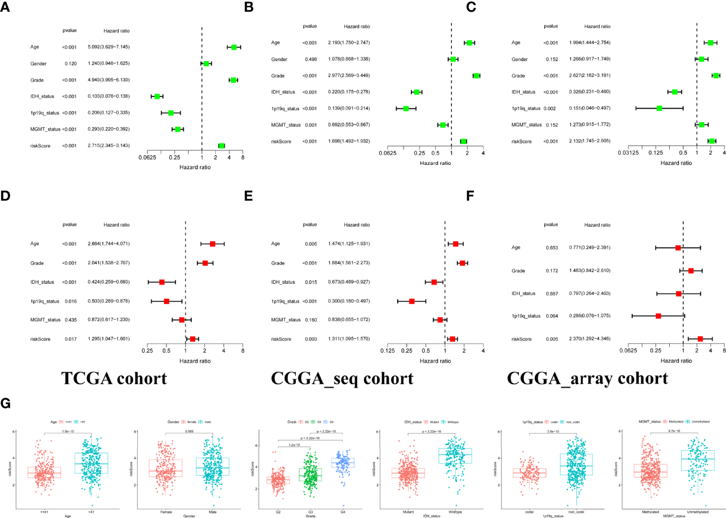 The association of risk and clinicopathological parameters with OS was evaluated using univariate Cox regression and multivariate Cox analysis. As shown by the forest plots of univariate analysis, similar to various clinical features including age, tumor grade, IDH mutation status, 1p19q codeletion, and MGMT methylation, the risk score could serve as an independent prognostic factor (p<0.001, HR:2.715, 1.698, 2.132, Figures 2A–C). Subsequently, we further performed multivariate Cox analysis to counterweigh the effects of other factors and found that the risk score remained statistically significant (p<0.05, HR: 1.295, 1.311, 2.370, Figures 2D–F). We also compared the risk score between glioma patients with different clinical characteristics in the TCGA set and found that the population classified as the high-risk group had higher risk scores (Figure 2G).