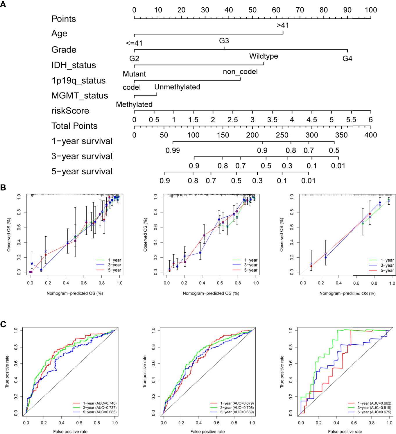 Figure 3 Construction of the nomogram for predicting overall survival. (A) Nomogram plot for predicting the survival rates of glioma patients at 1, 3, and 5 years in the TCGA cohort. (B) The calibration curves of the nomogram for assessing the consistency of actual and predicting OS at 1-, 3-, and 5-year in the training and the two test cohorts. (C) ROC curves of nomogram at 1, 3, and 5 years in the different datasets respectively.