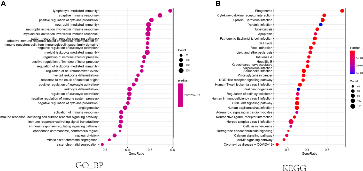 Figure 4 Functional enrichment analysis in the TCGA cohort. (A) The results of biological progress enrichment analysis of differently expressed genes between high- and low-risk subgroups. (B) Bubble graph for KEGG enrichment analysis.