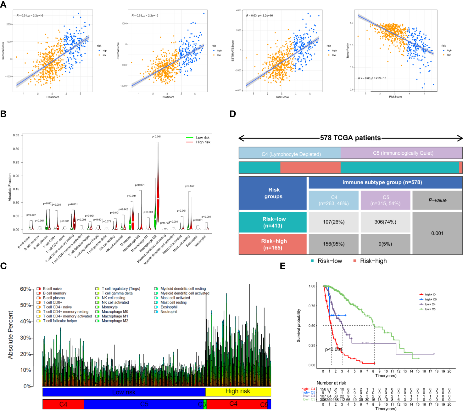 Figure 5 Tumor microenvironment and immune cell infiltration analysis in the TCGA cohort. (A)The correlation of immune scores, stromal scores, ESTIMATE scores, and tumor purity with risk scores. (B) Comparison of the degree of infiltration of 22 immune cells in the different risk groups. (C) The absolute fraction of immune cells between different subgroups in the TCGA glioma patients. (D) Heatmap and table showing the distribution of immune subtype between the two risk groups in the TCGA cohort. (E) Comparison of the survival difference between groupings after combining risk signature and immune subtypes by Kaplan–Meier survival curves.