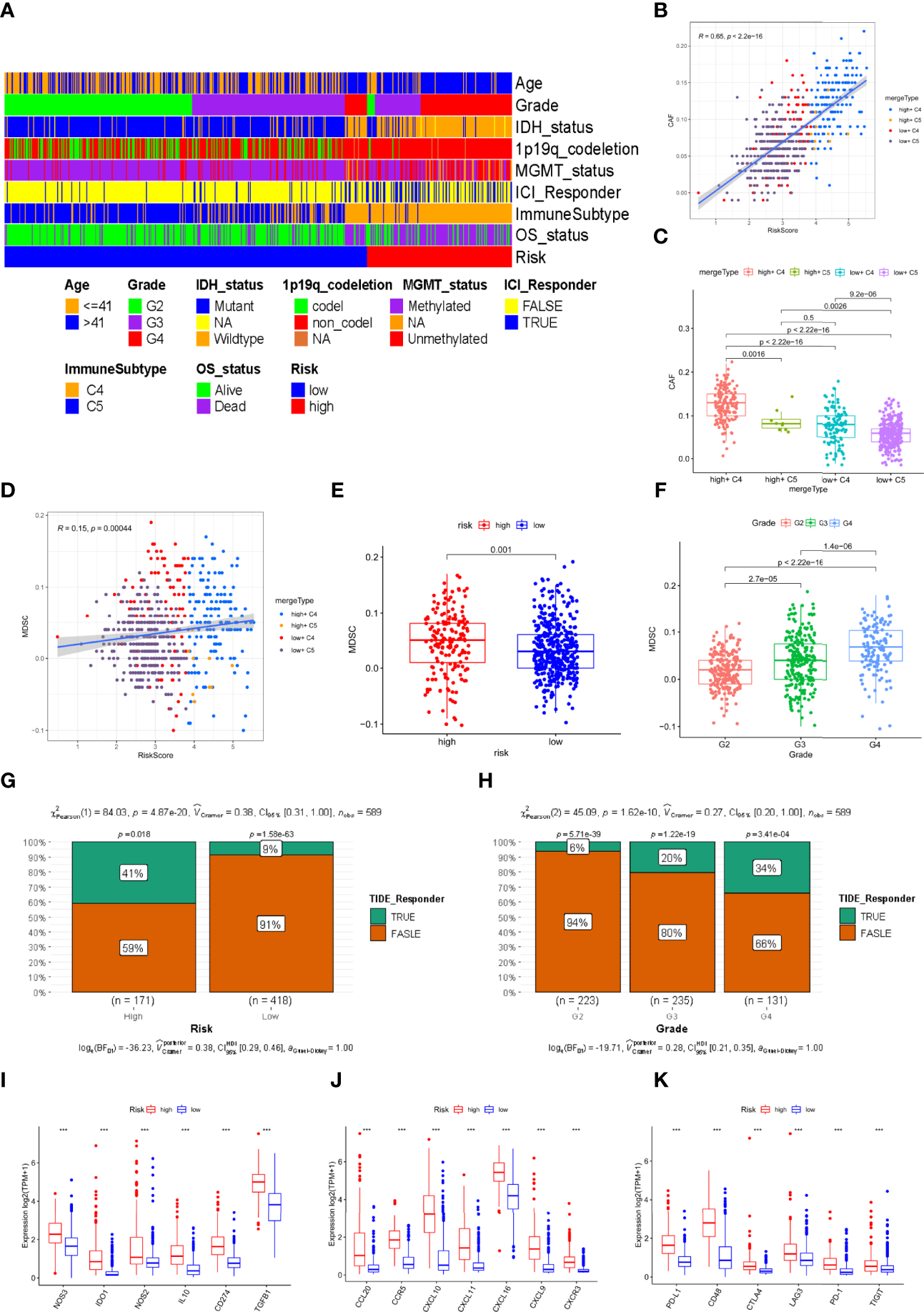 To investigate the infiltration of CAFs and MDSCs in glioma patients in the TCGA cohort, we used the TIDE database. Furthermore, we constructed a heatmap to summarize and reveal the distribution of various traits in the risk signature. As shown in the plot, we found that almost all patients from the high-risk subgroup had the C4 immune subtype, tumor grade 3 or 4, and high mortality, with a higher proportion of poor prognostic factors such as IDH wild type, 1p19q non-codeletion, and MGMT unmethylation. The opposite trends were noted in the populations with a low risk. (Figure 6A). CAFs were significantly positively related to the risk score (R=0.65, Figure 6B). Comparing the infiltration score of CAFs between different risk groupings and immune subtypes, we found that CAFs were more enriched in the populations with high-risk scores and C4 immune subtypes (Figure 6C). We also visualized the correlation of MDSCs with risk scores and different MDSCs between different groupings and tumor grades. Unexpectedly, the results indicated that MDSCs were weakly correlated with risk scores (Figure 6D) but they had a higher infiltration fraction in the high-risk subgroup (Figure 6E) and tumor grade 4 (Figure 6F). Additionally, we assessed the difference of CAF and MDSC infiltration fractions in patients with different clinical characteristics. Unexpectedly, the infiltration score of MDSCs in the 1p19q codeletion group was higher than in the non-codeletion group and CAFs were highly enriched in the 1p19q non-codeletion population. The remaining results showed that MDSCs and CAFs were less infiltrated in patients with favorable clinical characteristics, such as young age, IDH mutant, and MGMT methylation (Supplementary Figures 3A, B). Since TCGA patients have not received ICI treatment, we aimed to calculate the response rate of glioma patients to immune checkpoint inhibitors by the TIDE algorithm. The predicted results suggested that individuals with higher risk scores (Figure 6G) or tumor grade 4 (Figure 6H) obtained a better response compared to other group patients. Finally, we compared the expression levels of immunosuppressive cytokine genes in the low and high-risk groups, revealing that these genes were highly enriched in the high-risk group (Figure 6I). Additionally, tumor-associated chemokines (Figure 6J) and immune checkpoint genes (Figure 6K) were enriched to the same levels as immunosuppressive cytokines.