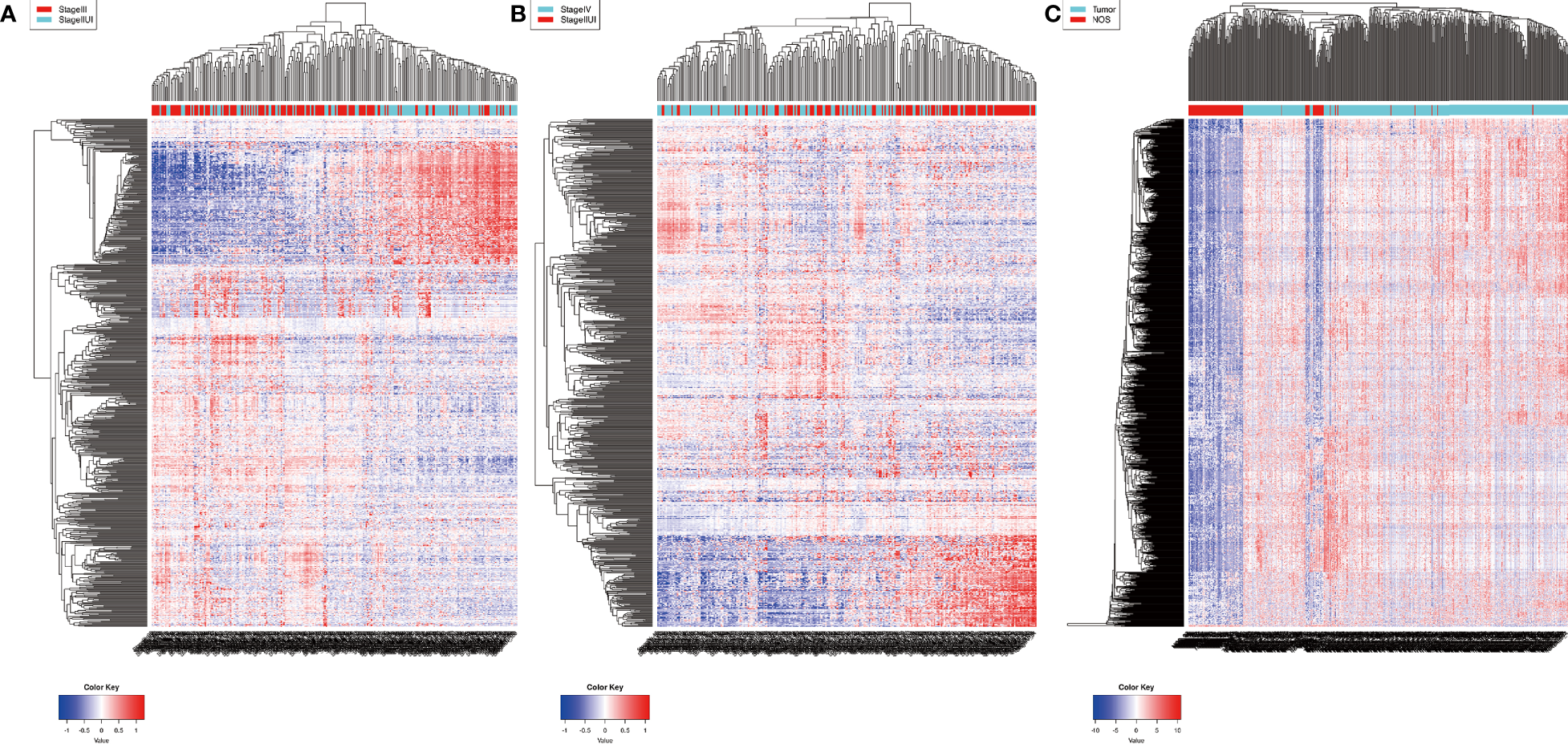 Identification of differentially expressed RNAs in bladder cancer. heatmap (A, B) 2076 mRNAs and 381 lncRNAs were differentially expressed between ACS-BCa and LCA-BCa samples (429 and 501 upregulated mRNAs, 59 and 38 upregulated lncRNAs, and, 138 and 101 downregulated mRNAs, 17 and 23 down-regulated lncRNAs) (P < 0.05, |fold change (FC)| > 2.0); heatmap (C)1696 miRNAs were differentially expressed in BCa compared to non-cancerous tissue samples (1593 up-regulated and 103 down-regulated) (P < 0.01, |FC| > 2.0).